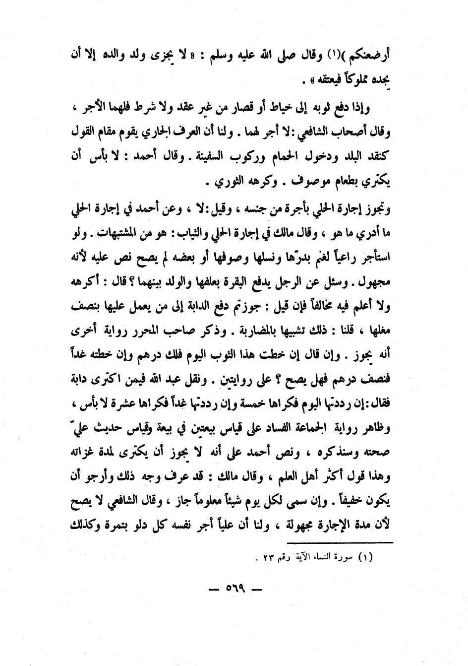 وقال: "لا يجزي ولد والده إلا أن يجده مملوكاً فيعتقه". 1 وإذا دفع ثوبه إلى خياط أو قصار من غير عقد ولا شرط فلهما الأجر، وقال أصحاب الشافعي: لا أجر لهما. ولنا: أن العرف الجاري يقوم مقام القول، كنقد البلد، ودخول الحمام، وركوب السفينة. وقال أحمد: لا بأس أن يكتري بطعام موصوف، وكرهه الثوري. وتجوز إجارة الحلي بأجرة من جنسه، وقيل: لا، وعن أحمد في إجارة الحلي: ما أدري ما هو. وقال مالك في إجارة الحلي والثياب: هو من المشتبهات.