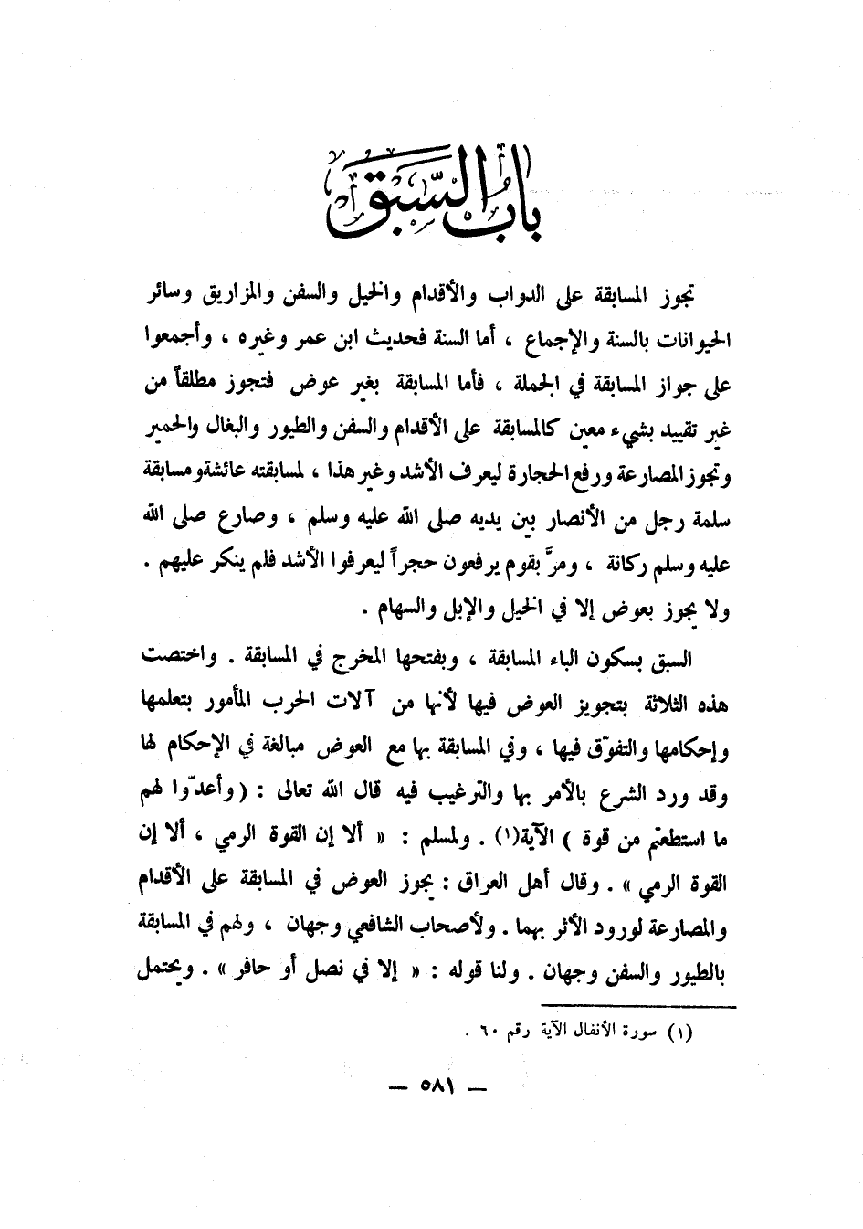 السبْق بسكون الباء: المسابقة، وبفتحها المخرج في المسابقة. واختصت هذه الثلاثة بتجويز العوض فيها، لأنها من آلات الحرب المأمور بتعلمها وإحكامها والتفوّق فيها، وفي المسابقة بها مع العوض مبالغة في الإحكام لها؛ وقد ورد الشرع بالأمر بها والترغيب فيه، قال الله تعالى: {وَأَعِدُّوا لَهُمْ مَا اسْتَطَعْتُمْ مِنْ قُوَّةٍ} الآية. 1 ولمسلم: "ألا إن القوة الرمي، ألا إن القوة الرمي". 2 وقال أهل العراق: يجوز العوض في المسابقة على الأقدام والمصارعة، لورود الأثر بهما. ولأصحاب الشافعي وجهان، ولهم في المسابقة بالطيور والسفن وجهان. ولنا: قوله: "إلا في نصل أو حافر" 3 ويحتمل