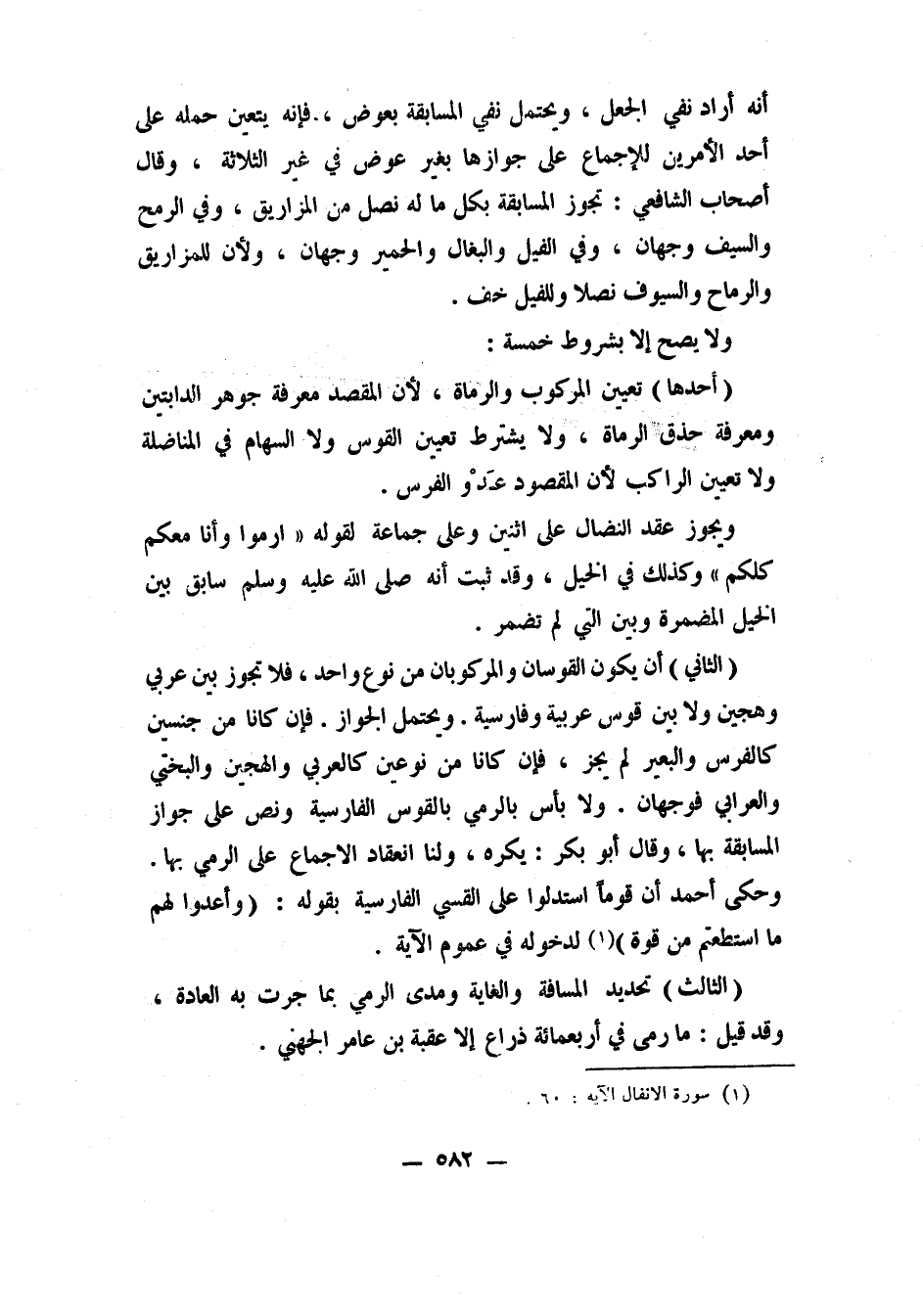 (الثاني) : أن يكون القوسان والمركوبان من نوع واحد، فلا تجوز بين عربي وهجين، ولا بين قوس عربية وفارسية. ويحتمل الجواز. فإن كانا من جنسين كالفرس والبعير لم يجز، فإن كانا من نوعين كالعربي والهجين والبختي والعرابي فوجهان. ولا بأس بالرمي بالقوس الفارسية، ونص على جواز المسابقة بها، وقال أبو بكر: يكره. ولنا: انعقاد الإجماع على الرمي بها. وحكى أحمد أن قوماً استدلوا على القسي الفارسية بقوله: {وَأَعِدُّوا لَهُمْ مَا اسْتَطَعْتُمْ مِنْ قُوَّةٍ} 3 لدخوله في عموم الآية.