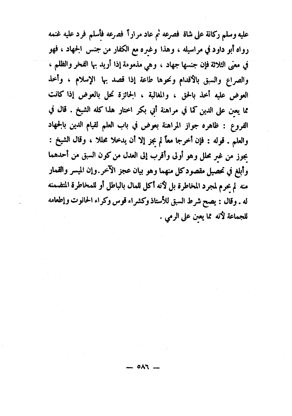 عليه وسلم ركانة على شاة، فصرعه. ثم عاد مراراً فصرعه. فأسلم، فردّ عليه غنمه". 1 رواه أبو داود في مراسيله، وهذا وغيره مع الكفار من جنس الجهاد، فهو في معنى الثلاثة فإن جنسها جها؛، وهي مذمومة إذا أريد بها الفخر والظلم. والصراع والسبق بالأقدام ونحوها طاعة، إذا قصد بها الإسلام، وأخذ العوض عليه أخذ بالحق. والمغالبة الجائزة تحل بالعوض، إذا كانت مما يعين على الدِّين، كما في مراهنة أبي بكر، اختار هذا كله الشيخ. قال في الفروع: ظاهره جواز المراهنة بعوض في باب العلم لقيام الدِّين بالجهاد والعلم. قوله: فإن أخرجا معاً لم يجز، إلا أن يدخلا محلِّلاً، وقال الشيخ: يجوز من غير محلل، وهو أولى وأقرب إلى العدل من كون السبق من أحدهما، وأبلغ في تحصيل مقصود كل منهما، وهو بيان عجز الآخر. وإن الميسر والقمار منه لم يحرم لمجرد المخاطرة، بل لأنه أكل للمال بالباطل، أو للمخاطرة المتضمنه له. وقال: يصح شرط السبق للأستاذ، وكشراء قوس وكراء الحانوت وإطعامه للجماعة، لأنه مما يعين على الرمي.