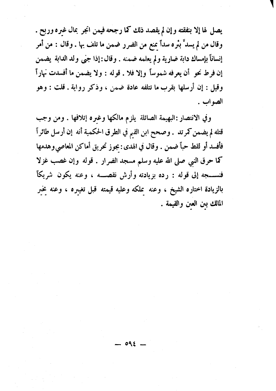 يصل لها إلا بنفقته، وإن لم يقصد ذلك. كما رجحه فيمن اتجر بمال غيره وربح. وقال من لم يسدَّ بئره سداً يمنع من الضرر، ضمن ما تلف بها. وقال: من أمر إنساناً بإمساك دابة ضارية ولم يعلمه، ضمنه. وقال: إذا جنى ولد الدابة، يضمن إن فرط، نحو أن يعرفه شموساً، وإلا فلا. قوله: ولا يضمن ما أفسدت نهاراً، وقيل: إن أرسلها بقرب ما تتلفه عادة ضمن، وذكر رواية. قلت: وهو الصواب. وفي الانتصار: البهيمة الصائلة يلزم مالكها وغيره إتلافها. ومن وجب قتله لم يضمن كمرتد. وصحح ابن القيم في الطرق الحكمية: أنه إن أرسل طائراً فأفسد أو لقط حباً، ضمن. وقال في الهدي: يجوز تحريق أماكن المعاصي وهدمها، كما "حرق النبي صلى الله عليه وسلم مسجد الضرار". قوله: وإن غصب غزلاً فنسجه، إلى قوله: رده بزيادته وأرش نقصه. وعنه: يكون شريكاً بالزيادة، اختاره الشيخ. وعنه: يملكه وعليه قيمته قيل تغييره، وعنه: يخير المالك بين العين والقيمة.