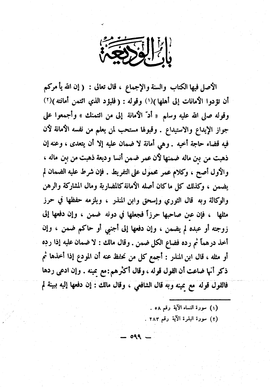 الأصل فيها: الكتاب والسنة والإجماع، قال تعالى: {إِنَّ اللَّهَ يَأْمُرُكُمْ أَنْ تُؤَدُّوا الأَمَانَاتِ إِلَى أَهْلِهَا} ، 1 وقوله: {فَلْيُؤَدِّ الَّذِي اؤْتُمِنَ أَمَانَتَهُ} ، 2 وقوله صلى الله عليه وسلم: "أدّ الأمانة إلى من ائتمنك". 3 وأجمعوا على جواز الإيداع والاستيداع. وقبولها مستحب لمن يعلم من نفسه الأمانة، لأن فيه قضاء حاجة أخيه. وهي أمانة لا ضمان عليه إلا أن يتعدى، وعنه: إن ذهبت من بين ماله ضمنها، "لأن عمر ضمن أنسا وديعة ذهبت من بين ماله"، والأول أصح، وكلام عمر محمول على التفريط. فإن شرط عليه الضمان لم يضمن، وكذلك كل ما كان أصله الأمانة كالمضاربة، ومال المشاركة، والرهن، والوكالة، وبه قال الثوري وإسحاق وابن المنذر. ويلزمه حفظها في حرز مثلها. فإن عيّن صاحبها حرزاً، فجعلها في دونه، ضمن. وإن دفعها إلى زوجته أو عبده لم يضمن. وإن دفعها إلى أجنبي أو حاكم ضمن. وإن أخذ درهماً ثم رده فضاع الكل ضمن. وقال مالك: لا ضمان عليه إذا رده أو مثله. قال ابن المنذر: أجمع كل من نحفظ عنه: أن المودع إذا أخذها، ثم ذكر أنها ضاعت، أن القول قوله. وقال أكثرهم: مع يمينه. وإن ادعى ردها فالقول قوله مع يمينه، وبه قال الشافعي. وقال مالك: إن دفعها إليه ببينة لم