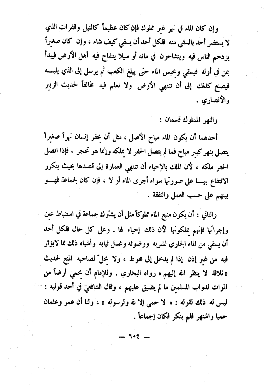 والثاني: أن يكون منبع الماء مملوكاً مثل أن يشترك جماعة في استنباط عين وإجرائها، فإنهم يملكونها، لأن ذلك إحياء لها. وعلى كل حال، فلكل أحد أن يسقي من الماء الجاري لشربه ووضوئه وغسل ثيابه وأشباه ذلك، مما لا يؤثر فيه، من غير إذن إذا لم يدخل إلى محوط، ولا يحلّ لصاحبه المنع، لحديث: "ثلاثة لا ينظر الله إليهم". 1 رواه البخاري.
