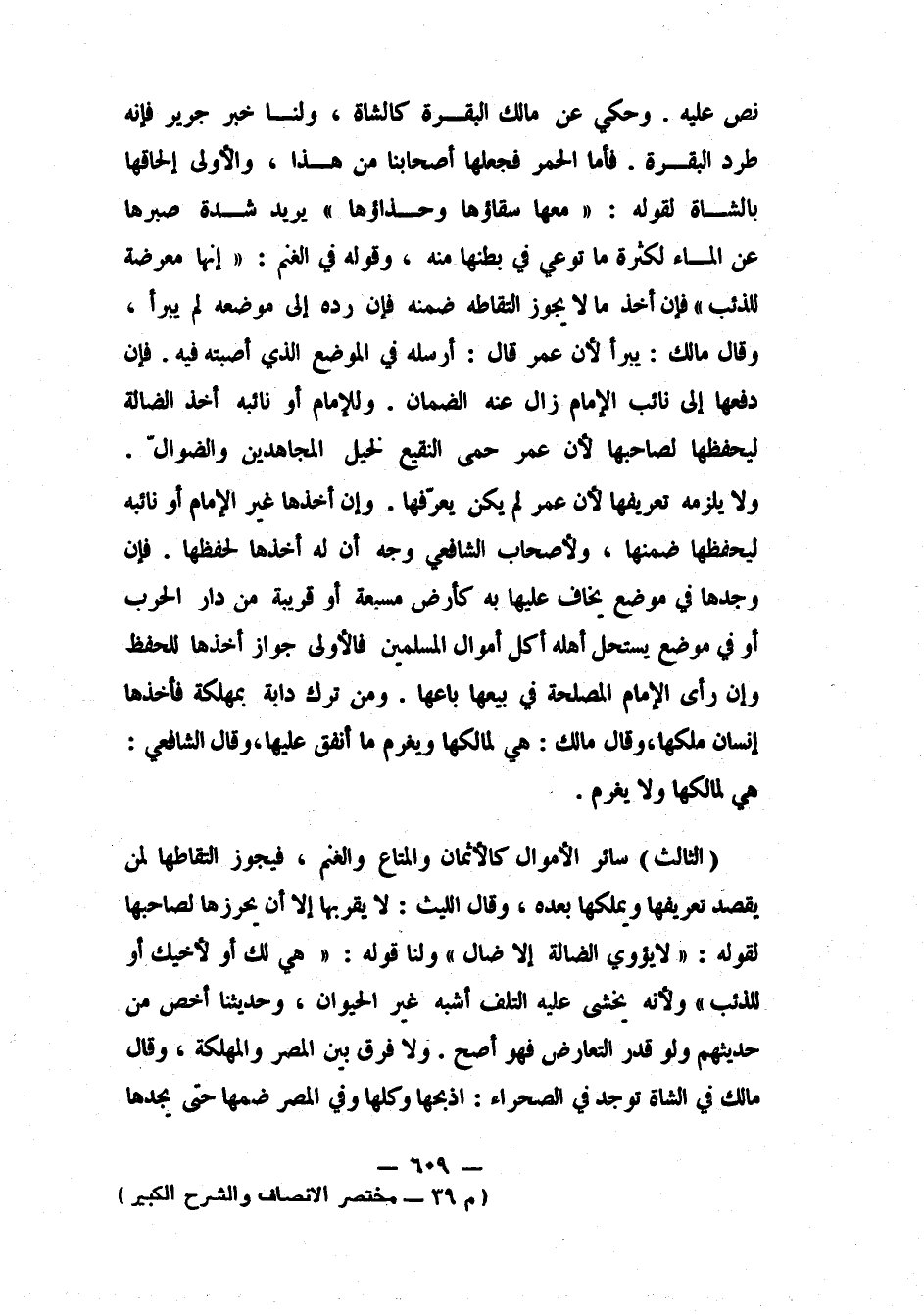 الثالث: سائر الأموال، كالأثمان والمتاع والغنم، فيجوز التقاطها لمن يقصد تعريفها، ويملكها بعده. وقال الليث: لا يقربها إلا أن يحرزها لصاحبها، لقوله: "لا يؤوي الضالة إلا ضال" 2 ولنا: قوله: "هي لك أو لأخيك أو للذئب"، 3 ولأنه يخشى عليه التلف، أشبه غير الحيوان، وحديثنا أخص من حديثهم، ولو قدر التعارض فهو أصح.