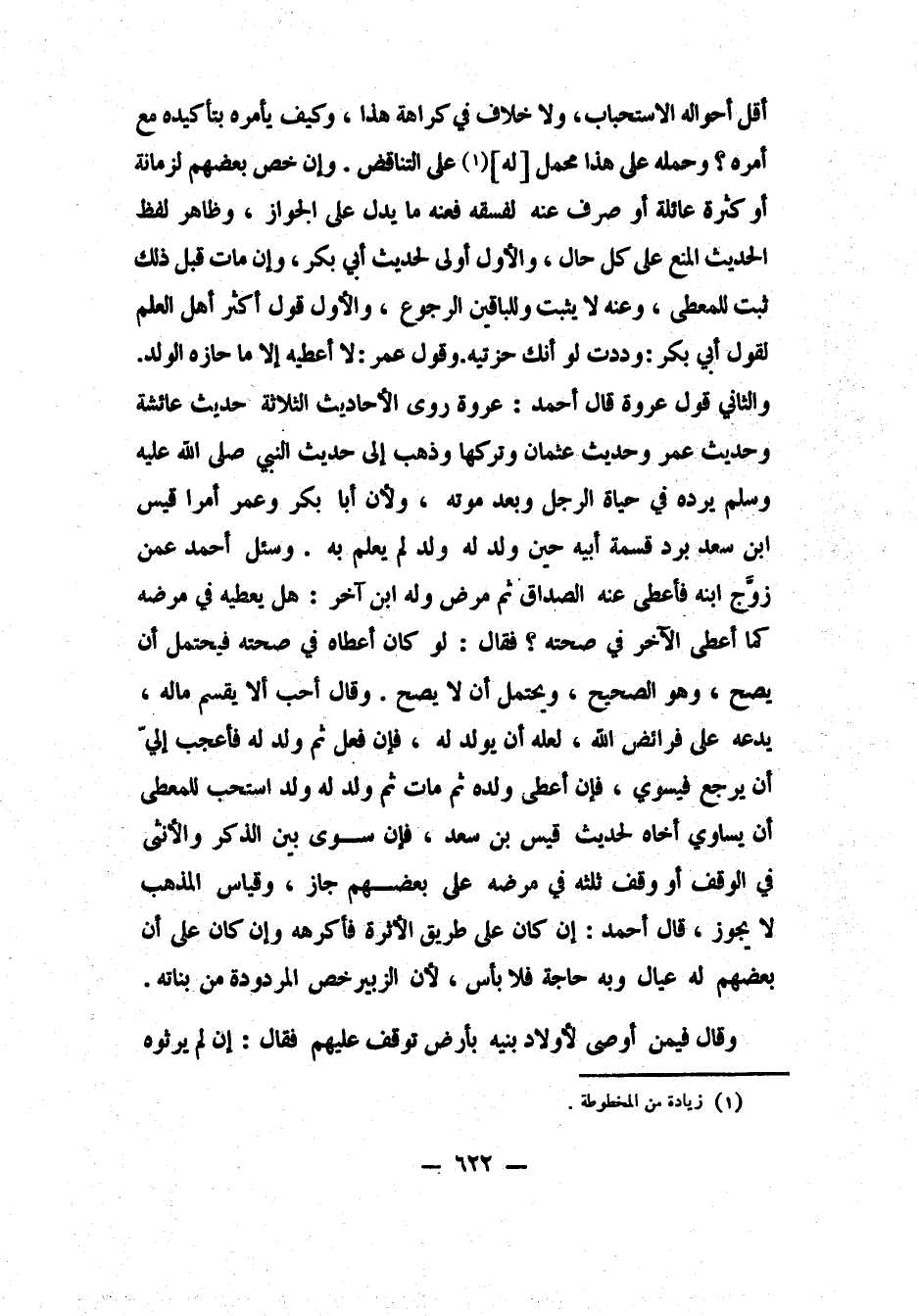 وسئل أحمد: عمن زوَّج ابنه فأعطى عنه الصداق ثم مرض، وله ابن آخر، هل يعطيه في مرضه كما أعطى الآخر في صحته؟ فقال: لو كان أعطاه في صحته فيحتمل أن يصح، وهو الصحيح، ويحتمل أن لا يصح. وقال أحب ألا يقسم ماله، يدعه على فرائض الله، لعله أن يولد له؛ فإن فعل ثم وُلد له، فأعجب إليّ أن يرجع فيسوي. فإن أعطى ولده ثم مات، ثم ولد له ولد، استحب للمعطي أن يساوي أخاه، لحديث قيس بن سعد. فإن سوى بين الذكر والأنثى في الوقف، أو وقف ثلثه في مرضه على بعضهم، جاز، وقياس المذهب: لا يجوز. قال أحمد: إن كان على طريق الأثرة فأكرهه، وإن كان على أن بعضهم له عيال وبه حاجة فلا بأس، "لأن الزبير خص المردودة من بناته". وقال فيمن أوصى لأولاد بنيه بأرض توقف عليهم، فقال: إن لم يرثوه