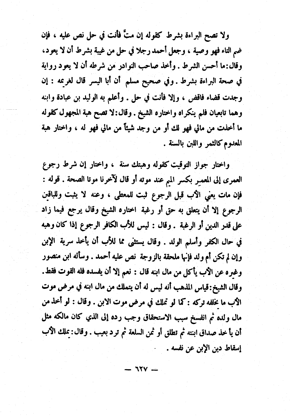 واختار جواز التوقيت كقوله: وهبتك سنة، واختار، إن شرط رجوع العمرى إلى المعمِر بكسر الميم عند موته، أو قال: لآخرنا موتاً، الصحة. قوله: فإن مات يعني: الأب قبل الرجوع ثبت للمعطى، وعنه: لا يثبت، وللباقين الرجوع، إلا أن يتعلق به حق أو رغبة، اختاره الشيخ. وقال: يرجع فيما زاد على قدر الديْن أو الرغبة.