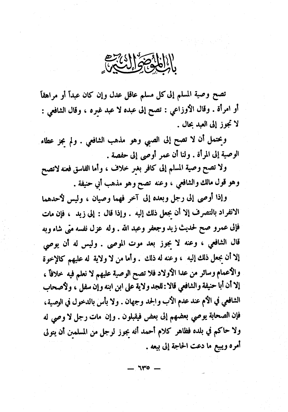 تصح وصية المسلم إلى كل مسلم عاقل عدل، وإن كان عبداً أو مراهقاً أو امرأة. وقال الأوزاعي: تصح إلى عبده لا عبد غيره. وقال الشافعي: لا تجوز إلى العبد بحال.