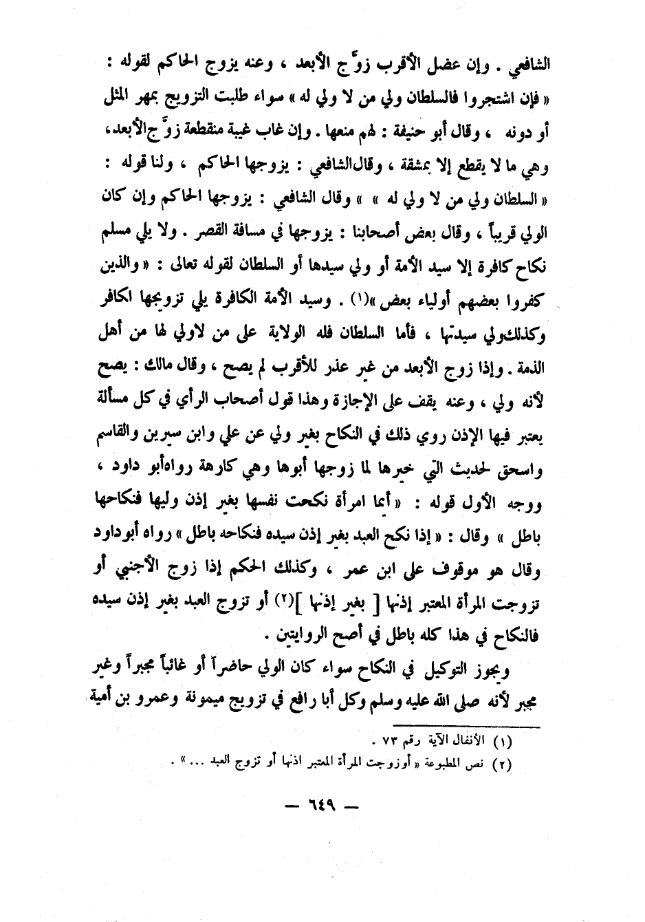 وإذا زوج الأبعد من غير عذر للأقرب لم يصح، وقال مالك: يصح لأنه ولي، وعنه: يقف على الإجازة، وهذا قول أصحاب الرأي في كل مسألة يعتبر فيها الإذن؛ روي ذلك في النكاح بغير ولي عن علي وابن سيرين والقاسم وإسحاق، لحديث التي خيرها لما زوجها أبوها وهي كارهة. رواه أبو داود، ووجه الأولى: قوله: "أيما امرأة نكحت نفسها بغير إذن وليها، فنكاحها باطل"، 4 وقال: "إذا نكح العبد بغير إذن سيده، فنكاحه باطل". 5 رواه أبو داود، وقال: هو موقوف على ابن عمر. وكذلك الحكم إذا زوج الأجنبي أو تزوجت المرأة المعتبر إذنها [بغير إذنها] ، 6 أو تزوج العبد بغير إذن سيده فالنكاح في هذا كله باطل في أصح الروايتين.