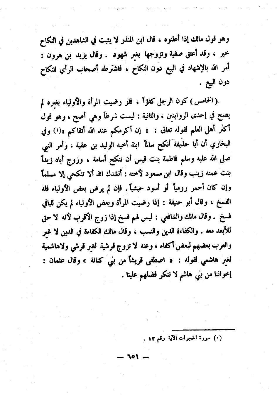 الخامس: كون الرجل كفؤاً، فلو رضيت المرأة والأولياء بغيره لم يصح، في إحدى الروايتين. والثانية: ليست شرطاً، وهي أصح؛ وهو قول أكثر أهل العلم، لقوله تعالى: {إِنَّ أَكْرَمَكُمْ عِنْدَ اللَّهِ أَتْقَاكُمْ} . 1 وفي البخاري: "أن أبا حذيفة أنكح سالماً ابنة أخيه الوليد بن عقبة. وأمر النبي صلى الله عليه وسلم فاطمة بنت قيس أن تنكح أسامة. وزوّج أباه زيداً بنت عمته زينب". وقال ابن مسعود لأخته:? " أنشدك الله ألا تنكحي إلا مسلماً، وإن كان أحمر رومياً أو أسود حبشياً". فإن لم يرض بعض الأولياء، فله الفسخ، وقال أبو حنيفة: إذا رضيت المرأة وبعض الأولياء لم يكن للباقي فسخ. وقال مالك والشافعي: ليس لهم فسخ إذا زوج الأقرب، لأنه لا حق للأبعد معه.