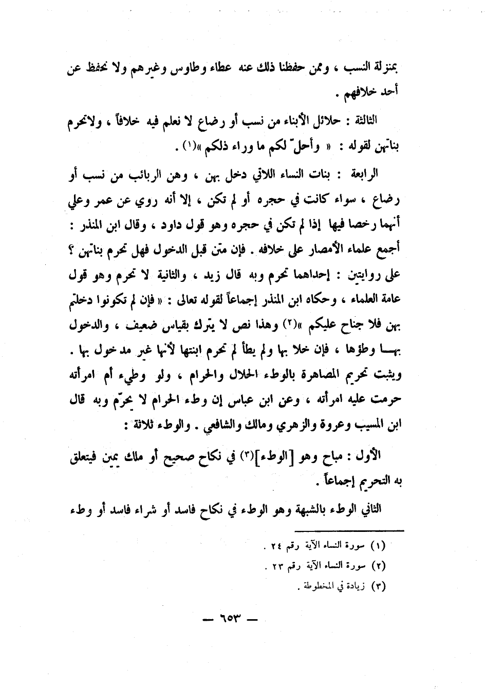 الرابعة: بنات النساء اللاتي دخل بهن، وهن الربائب من نسب أو رضاع، سواء كانت في حجره أو لم تكن؛ إلا أنه روي عن عمر وعلي: "أنهما رخصا فيها إذا لم تكن في حجره"، وهو قول داود. وقال ابن المنذر: أجمع علماء الأمصار على خلافه. فإن متن قبل الدخول، فهل تحرم بناتهن؟ على روايتين: إحداهما: تحرم، وبه قال زيد. والثانية: لا تحرم، وهو قول عامة العلماء؛ وحكاه ابن المنذر إجماعاً، لقوله تعالى: {فَإِنْ لَمْ تَكُونُوا دَخَلْتُمْ بِهِنَّ فَلا جُنَاحَ} ، 2 وهذا نص لا يترك بقياس ضعيف. والدخول بها: وطؤها. فإن خلا بها ولم يطأ لم تحرم ابنتها، لأنها غير مدخول بها. ويثبت تحريم المصاهرة بالوطء الحلال والحرام. ولو وطئ أم امرأته حرمت عليه امرأته. وعن ابن عباس: "إن وطء الحرام لا يحرِّم"، وبه قال ابن المسيب وعروة والزهري ومالك والشافعي. والوطء ثلاثة: