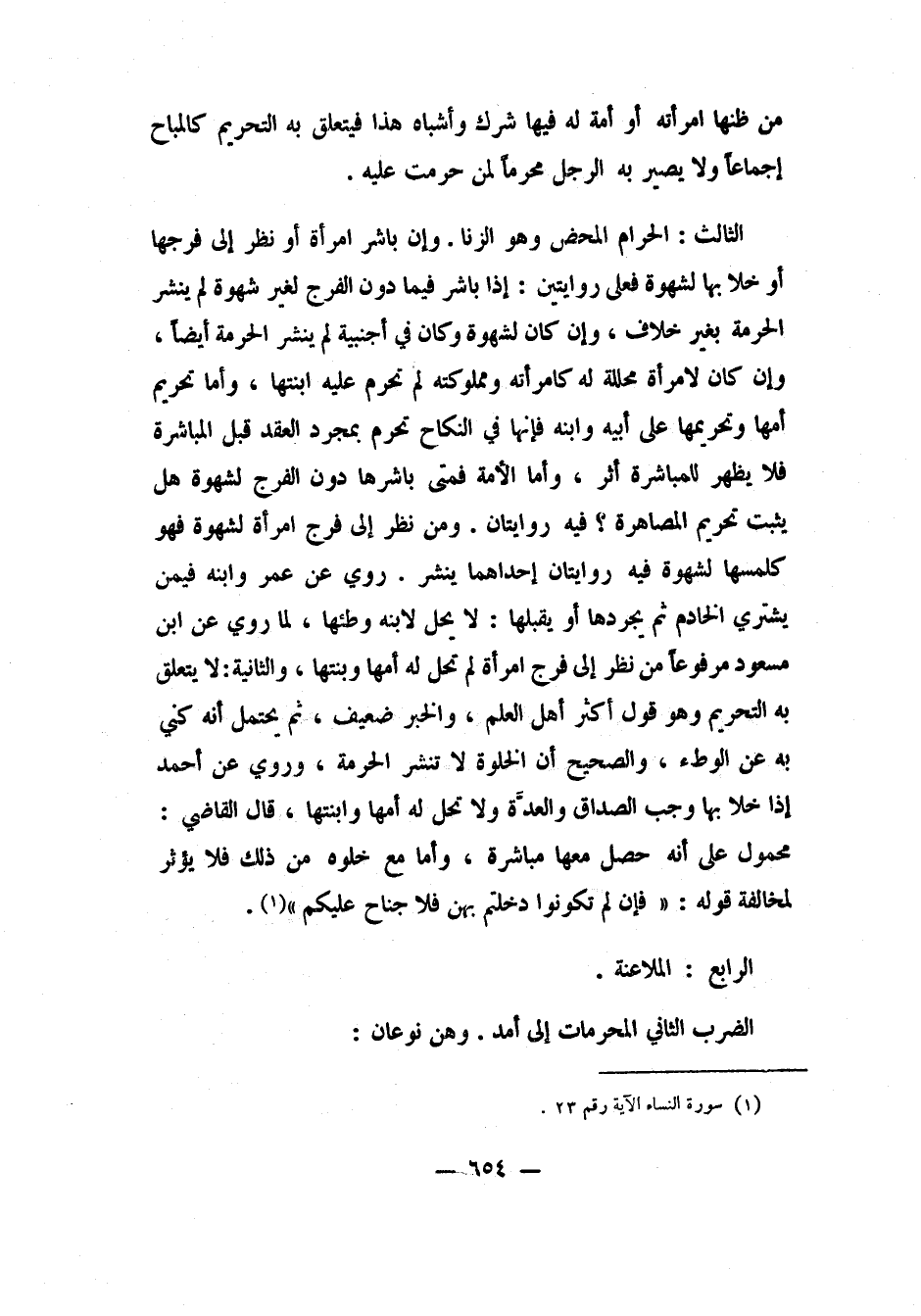 الثالث: الحرام المحض، وهو الزنى. وإن باشر امرأة، أو نظر إلى فرجها، أو خلا بها لشهوة، فعلى روايتين: إذا باشر فيما دون الفرج لغير شهوة لم ينشر الحرمة بغير خلاف، وإن كان لشهوة وكان في أجنبية لم ينشر الحرمة أيضاً. وإن كان لامرأة محللة له كامرأته ومملوكته لم تحرم عليه ابنتها.، وأما تحريم أمها وتحريمها على أبيه وابنه، فإنها في النكاح تحرم بمجرد العقد قبل المباشرة، فلا يظهر للمباشرة أثر. وأما الأمة فمتى باشرها دون الفرج لشهوة، هل يثبت تحريم المصاهرة؟ فيه روايتان. ومن نظر إلى فرج امرأة لشهوة، فهو كلمسها لشهوة فيه، روايتان: إحداهما: ينشر. روي عن عمر وابنه، فيمن يشتري الخادم ثم يجردها أو يقبّلها: "لا يحل لابنه وطؤها"، لما روي عن ابن مسعود، مرفوعاً: "من نظر إلى فرج امرأة لم تحل له أمها وبنتها". والثانية: لا يتعلق به التحريم، وهو قول أكثر أهل العلم، والخبر ضعيف. ثم يحتمل أنه كني به عن الوطء. والصحيح: أن الخلوة لا تنشر الحرمة. وروي عن أحمد: إذا خلا بها وجب الصداق والعدَّة، ولا تحل له أمها وابنتها. قال القاضي: محمول على أنه حصل معها مباشرة، وأما مع خلوه من ذلك فلا يؤثر، لمخالفة قوله: {فَإِنْ لَمْ تَكُونُوا دَخَلْتُمْ بِهِنَّ فَلا جُنَاحَ عَلَيْكُمْ} 1.