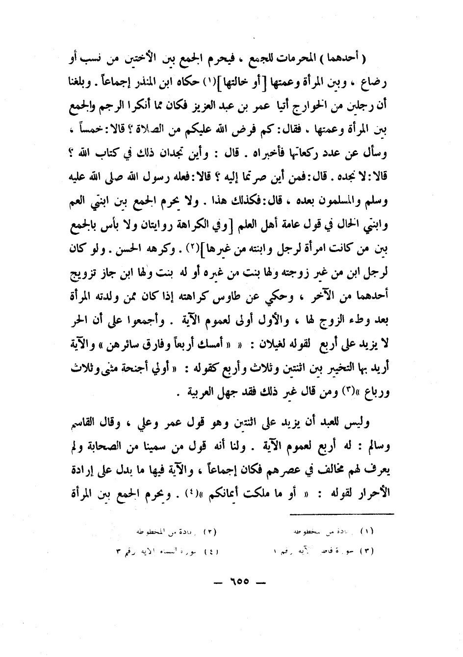 (أحدهما) : المحرمات للجمع: فيحرم الجمع بين الأختين من نسب أو رضاع، وبين المرأة وعمتها [أو خالتها] ، 1 حكاه ابن المنذر إجماعاً. وبلغنا: أن رجلين من الخوارج أتيا عمر بن عبد العزيز، فكان مما أنكرا: الرجم، والجمع بين المرأة وعمتها. فقال: كم فرض الله عليكم من الصلاة؟ قالا: خمساً، وسأل عن عدد ركعاتها فأخبراه. قال: وأين تجدان ذلك في كتاب الله؟ قالا: لا نجده. قال: فمن أين صرتما إليه؟ قالا: فعله رسول الله صلى الله عليه وسلم والمسلمون بعده، قال: فكذلك هذا. ولا يحرم الجمع بين ابنتي العم وابنتي الخال، في قول عامة أهل العلم. [وفي الكراهة روايتان، ولا بأس بالجمع بين من كانت امرأة لرجل وابنته من غيرها] . 2 وكرهه الحسن. ولو كان لرجل ابن من غير زوجته، ولها بنت من غيره، أو له بنت ولها ابن، جاز تزويج أحدهما من الآخر. وحكي عن طاووس كراهته إذا كان ممن ولدته المرأة بعد وطء الزوج لها؛ والأول أولى لعموم الآية. وأجمعوا على أن الحر لا يزيد على أربع لقوله لغيلان: "أمسك أربعة وفارق سائرهن ". 3 والآية أريد بها التخيير بين اثنتين وثلاث وأربع، كقوله: {أُولِي أَجْنِحَةٍ مَثْنَى وَثُلاثَ وَرُبَاعَ} ، 4 ومن قال غير ذلك فقد جهل العربية. و"ليس للعبد أن يزيد على اثنتين"، وهو قول عمر وعلي، وقال القاسم وسالم: له أربع، لعموم الآية. ولنا: أنه قول مَن سمّينا من الصحابة، ولم يعرف لهم مخالف في عصرهم فكان إجماعاً، والآية فيها ما يدل على إرادة الأحرار، لقوله: {أَوْ مَا مَلَكَتْ أَيْمَانُكُمْ} 5.