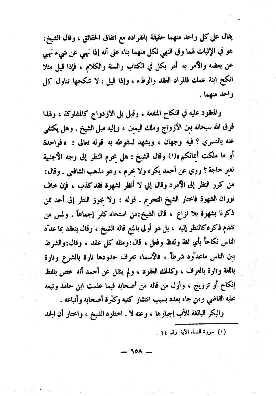 والمعقود عليه في النكاح: المنفعة، وقيل بل: الازدواج كالمشاركة؛ ولهذا فرق الله سبحانه بين الأزواج وملك اليمين، وإليه ميل الشيخ. وهل يكتفى عنه بالتسري؟ فيه وجهان، ويشهد لسقوطه به، قوله تعالى: {فَوَاحِدَةً أَوْ مَا مَلَكَتْ أَيْمَانُكُمْ} 1.