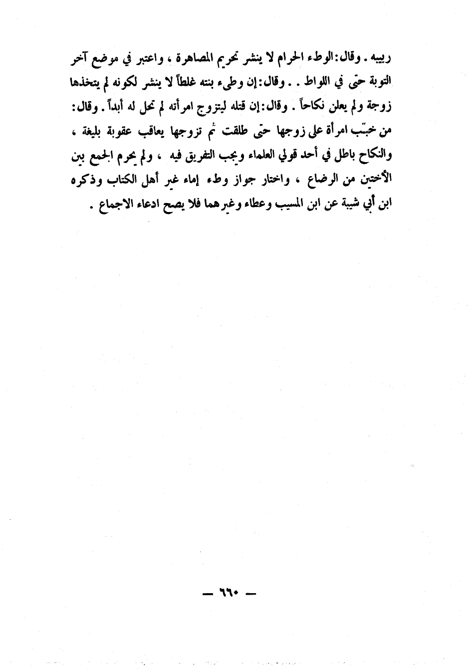 وقال: الوطء الحرام لا ينشر تحريم المصاهرة، واعتبر في موضع آخر التوبة حتى في اللواط. وقال: إن وطئ بنته غلطاً لا ينشر، لكونه لم يتخذها زوجة ولم يعلن نكاحاً.