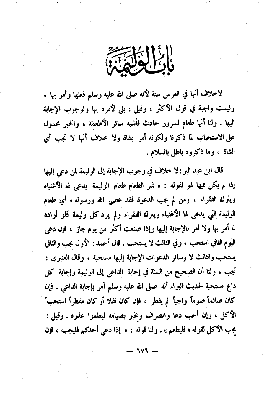 قال ابن عبد البر: لا خلاف في وجوب الإجابة إلى الوليمة، لمن دعي إليها إذا لم يكن فيها لهو، لقوله: "شر الطعام طعام الوليمة، يدعى لها الأغنياء ويترك الفقراء. ومن لم يجب الدعوة فقد عصى الله ورسوله". 1 أي: طعام الوليمة التي يدعى لها الأغنياء ويترك الفقراء، ولم يُرد كل وليمة، فلو أراده لما أمر بها ولا أمر بالإجابة إليها. وإذا صنعت أكثر من يوم جاز، فإن دعي اليوم الثاني استحب، وفي الثالث لا يُستحب. قال أحمد: الأول يجب، والثاني يستحب، والثالث لا. وسائر الدعوات الإجابة إليها مستحبة، وقال العنبري: تجب. ولنا: أن الصحيح من السنة في إجابة الداعي إلى الوليمة، وإجابة كل داع مستحبة، لحديث البراء: "أنه صلى الله عليه وسلم أمر بإجابة الداعي". فإن كان صائماً صوماً واجباً لم يفطر، فإن كان نفلاً أو كان مفطراً استحبّ الأكل. وإن أحب دعا وانصرف، ويخبر بصيامه ليعلموا عذره. وقيل: يجب الأكل لقوله: "فليطعم". ولنا: قوله: "إذا دعي أحدكم فليجب. فإن