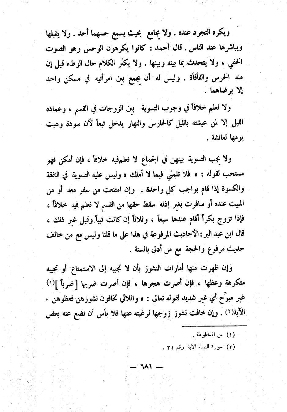ولا نعلم خلافاً في وجوب التسوية بين الزوجات في القسم، وعماده الليل، إلا لمن عيشته بالليل كالحارس، والنهار يدخل تبعاً "لأن سودة وهبت يومها لعائشة". ولا يجب التسوية بينهن في الجماع، لا نعلم فيه خلافاً، فإن أمكن فهو مستحب، لقوله: "فلا تلمني فيما لا أملك". 1 وليس عليه التسوية في النفقة والكسوة إذا قام بواجب كل واحدة. وإن امتنعت من سفر معه، أو من المبيت عنده، أو سافرت بغير إذنه، سقط حقها من القسم، لا نعلم فيه خلافاً. فإذا تزوج بكراً أقام عندها سبعاً، وثلاثاً إن كانت ثيباً، وقيل غير ذلك. قال ابن عبد البر: الأحاديث المرفوعة في هذا على ما قلنا، وليس مع من خالف حديث مرفوع، والحجة مع من أدلى بالسنة.