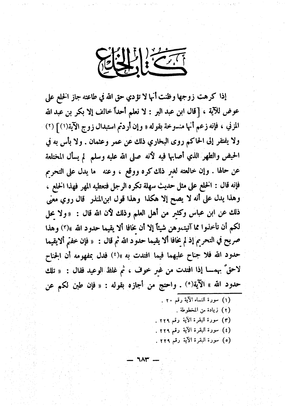 إذا كرهت زوجها وظنت أنها لا تؤدي حق الله في طاعته، جاز الخلع على عوض، للآية. [قال ابن عبد البر: لا نعلم أحداً خالف، إلا بكر بن عبد الله المزني، فإنه زعم أنها منسوخة بقوله: {وَإِنْ أَرَدْتُمُ اسْتِبْدَالَ زَوْجٍ} الآية 1] . 2 و"لا يفتقر إلى الحاكم"، روى البخاري ذلك عن عمر وعثمان. ولا بأس به في الحيض والطهر الذي أصابها فيه، لأنه صلى الله عليه وسلم لم يسأل المختلعة عن حالها. وإن خالعته لغير ذلك كره ووقع، وعنه: ما يدل على التحريم، فإنه قال: الخلع على مثل حديث سهلة، تكره الرجل فتعطيه المهر، فهذا الخلع؛ وهذا يدل على أنه لا يصح إلا هكذا، وهذا قول ابن المنذر قال: روي معنى ذلك عن ابن عباس وكثير من أهل العلم، وذلك لأن الله قال: {وَلا يَحِلُّ لَكُمْ أَنْ تَأْخُذُوا مِمَّا آتَيْتُمُوهُنَّ شَيْئاً إِلَّا أَنْ يَخَافَا أَلاَّ يُقِيمَا حُدُودَ اللَّهِ} ، 3 وهذا صريح في التحريم إذ لم يخافا ألا يقيما حدود الله. ثم قال: {فَإِنْ خِفْتُمْ أَلاَّ يُقِيمَا حُدُودَ اللَّهِ فَلا جُنَاحَ عَلَيْهِمَا فِيمَا افْتَدَتْ بِهِ} ، 4 فدل بمفهومه أن الجناح لاحقٌ بهما إذا افتدت من غير خوف، ثم غلظ الوعيد فقال: {تِلْكَ حُدُودُ} الآية. 5 واحتج من أجازه بقوله: {فَإِنْ طِبْنَ لَكُمْ عَنْ