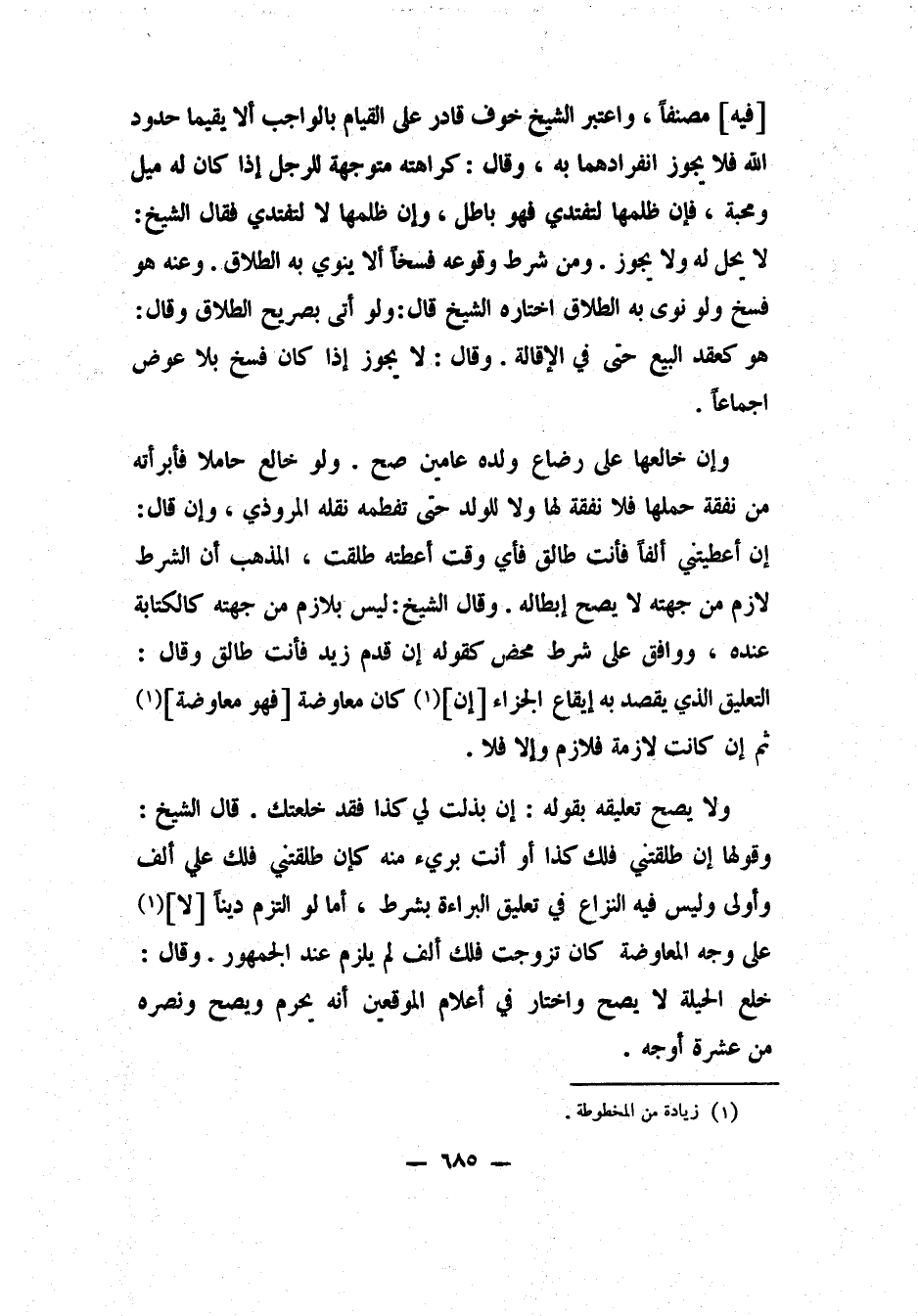 [فيه] مصنفاً. واعتبر الشيخ خوف قادر على القيام بالواجب ألا يقيما حدود الله، فلا يجوز انفرادهما به. وقال: كراهته متوجهة للرجل إذا كان له ميل ومحبة، فإن ظلمها لتفتدي فهو باطل. وإن ظلمها لا لتفتدي، فقال الشيخ: لا يحل له ولا يجوز. ومن شرط وقوعه فسخاً ألا ينوي به الطلاق. وعنه: هو فسخ، ولو نوى به الطلاق، اختاره الشيخ قال: ولو أتى بصريح الطلاق. وقال: هو كعقد البيع حتى في الإقالة. وقال: لا يجوز إذا كان فسخ بلا عوض إجماعاً. وإن خالعها على رضاع ولده عامين صح.