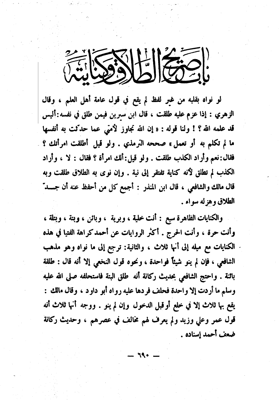 والكنايات الظاهرة سبع: أنت خلية، وبرية، وبائن، وبتة، وبتلة، وأنت حرة، وأنت الحرج. أكثر الروايات عن أحمد كراهة الفتيا في هذه الكنايات مع ميله إلى أنها ثلاث. والثانية: ترجع إلى ما نواه، وهو مذهب الشافعي. فإن لم ينو شيئاً فواحدة. ونحوه قول النخعي، إلا أنه قال: طلقة بائنة. واحتج الشافعي بحديث ركانة، "أنه طلق البتة فاستحلفه صلى الله عليه وسلم: ما أردت إلا واحدة، فحلف فردّها عليه". رواه أبو داود. وقال مالك: يقع بها ثلاث، إلا في خلع، أو قبل الدخول، وإن لم ينو؛ ووجه أنها ثلاث: أنه قول عمر وعلي وزيد، ولم يعرف لهم مخالف في عصرهم، وحديث ركانة ضعف أحمد إسناده