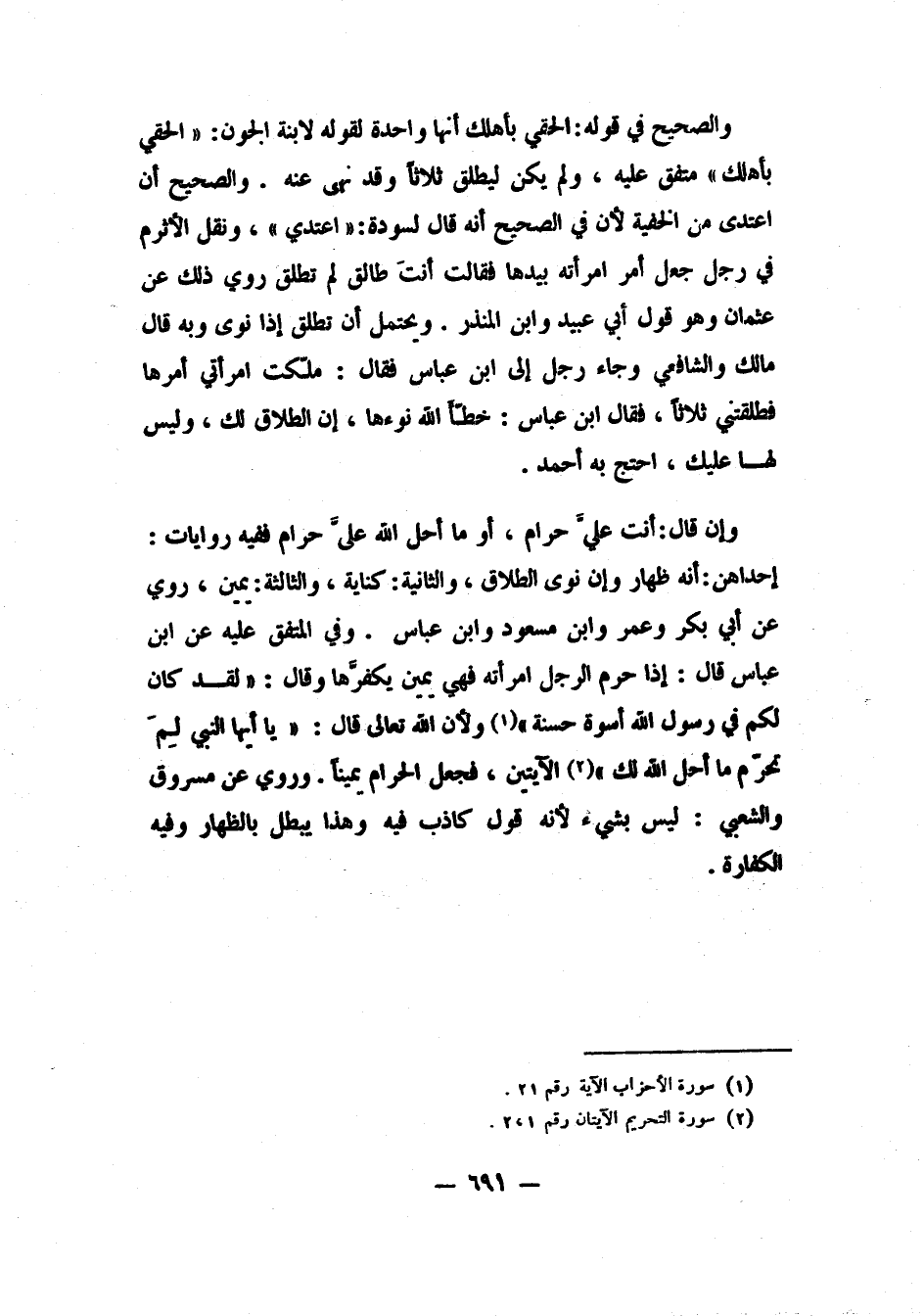 وإن قال: "أنت عليَّ حرام"، أو "ما أحل الله عليَّ حرام"، ففيه روايات: إحداهن: أنه ظهار وإن نوى الطلاق. والثانية: كناية. والثالثة: "يمين"، روي عن أبي بكر وعمر وابن مسعود وابن عباس. وفي المتفق عليه عن ابن عباس قال: "إذا حرّم الرجل امرأته فهي يمين يكفرَّها، وقال: {لَقَدْ كَانَ لَكُمْ فِي رَسُولِ اللَّهِ أُسْوَةٌ حَسَنَةٌ} ، 2 ولأن الله تعالى قال: {يَا أَيُّهَا النَّبِيُّ لِمَ تُحَرِّمُ مَا أَحَلَّ اللَّهُ لَكَ} 3 فجعل الحرام يميناً". وروي عن مسروق والشعبي: ليس بشيء لأنه قول كاذب فيه، وهذا يبطل بالظهار وفيه الكفارة.