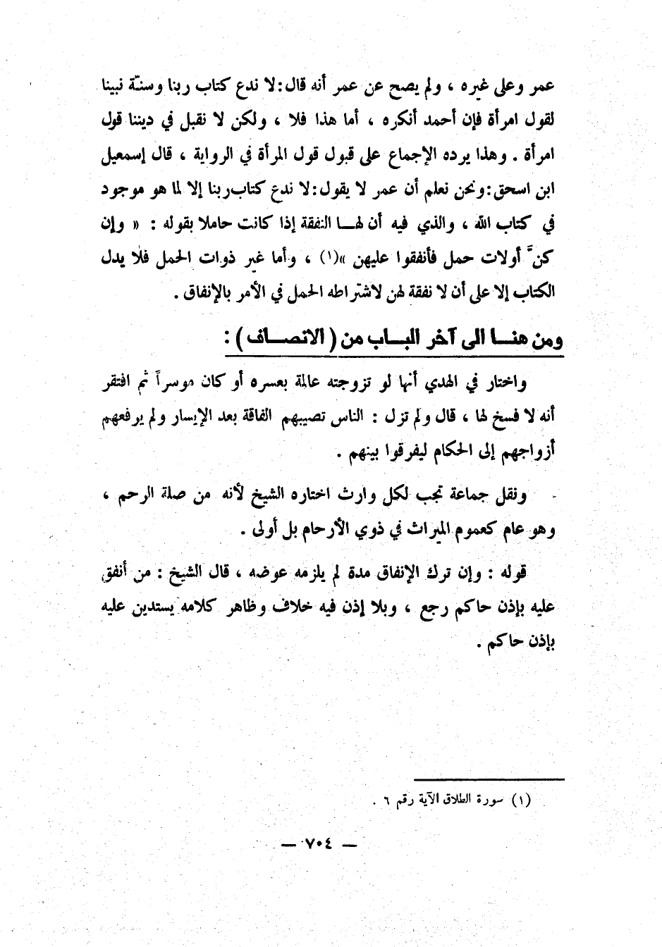 عمر وعلى غيره. ولم يصح عن عمر أنه قال: لا ندع كتاب ربنا وسنّة نبينا لقول امرأة، فإن أحمد أنكره. أما هذا فلا، ولكن لا نقبل في ديننا قول امرأة. وهذا يرده الإجماع على قبول قول المرأة في الرواية، قال إسماعيل بن إسحاق: ونحن نعلم أن عمر لا يقول: لا ندع كتاب ربنا إلا لما هو موجود في كتاب الله، والذي فيه أن لها النفقة إذا كانت حاملاً بقوله: {وَإِنْ كُنَّ أُولاتِ حَمْلٍ فَأَنْفِقُوا عَلَيْهِنَّ} ، 1 وأما غير ذوات الحمل فلا يدل الكتاب إلا على أن لا نفقة لهن لاشتراطه الحمل في الأمر بالإنفاق.