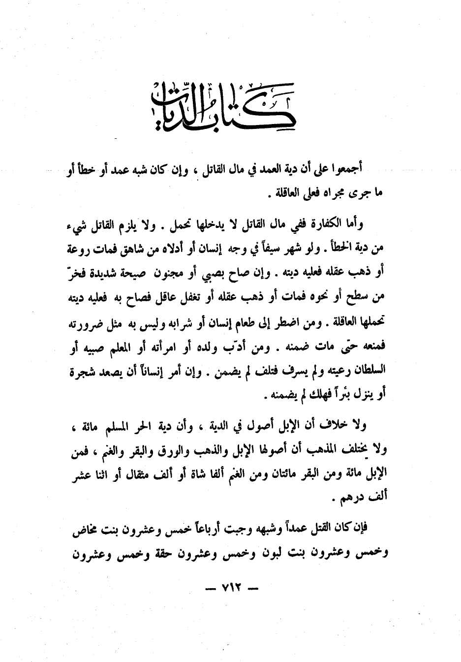 ولا خلاف أن الإبل أصول في الدية، وأن دية الحر المسلم: مائة. ولا يختلف المذهب أن أصولها: الإبل والذهب والورق والبقر والغنم. فمن الإبل: مائة، ومن البقر: مائتان، ومن الغنم: ألفا شاة، أو ألف مثقال، أو اثنا عشر ألف درهم.
