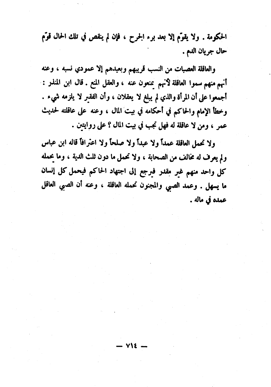 والعاقلة: العصبات من النسب، قريبهم وبعيدهم إلا عمودي نسبه. وعنه: أنهم منهم، سموا: "العاقلة"، لأنهم يمنعون عنه، والعقل: المنع. قال ابن المنذر: أجمعوا على أن المرأة والذي لم يبلغ لا يعقلان، وأن الفقير لا يلزمه شيء. وخطأ الإمام والحاكم في أحكامه في بيت المال، وعنه: على عاقلته، لحديث عمر. ومن لا عاقلة له، فهل تجب في بيت المال؟ على روايتين.