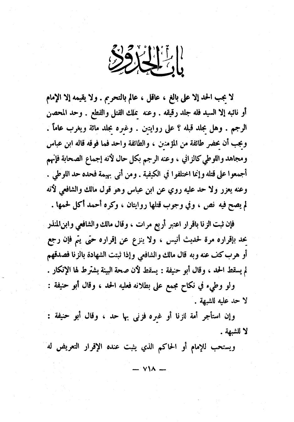 لا يجب الحد إلا على بالغ، عاقل، عالم بالتحريم. ولا يقيمه إلا الإمام أو نائبه، إلا السيد فله جلد رقيقه. وعنه: يملك القتل والقطع. وحد المحصن: الرجم. وهل يجلد قبله؟ على روايتين. وغيره: يجلد مائة ويغرب عاماً. ويجب أن يحضر طائفة من المؤمنين، و"الطائفة: واحد فما فوقه"، قاله ابن عباس ومجاهد. واللوطي كالزاني، وعنه: الرجم بكل حال، لأنه إجماع الصحابة "فإنهم أجمعوا على قتله، وإنما اختلفوا في الكيفية". ومن أتى بهيمة فحده حد اللوطي. وعنه: "يعزر ولا حد عليه"، روي عن ابن عباس، وهو قول مالك والشافعي، لأنه لم يصح فيه نص. وفي وجوب قتلها روايتان، وكره أحمد أكل لحمها.