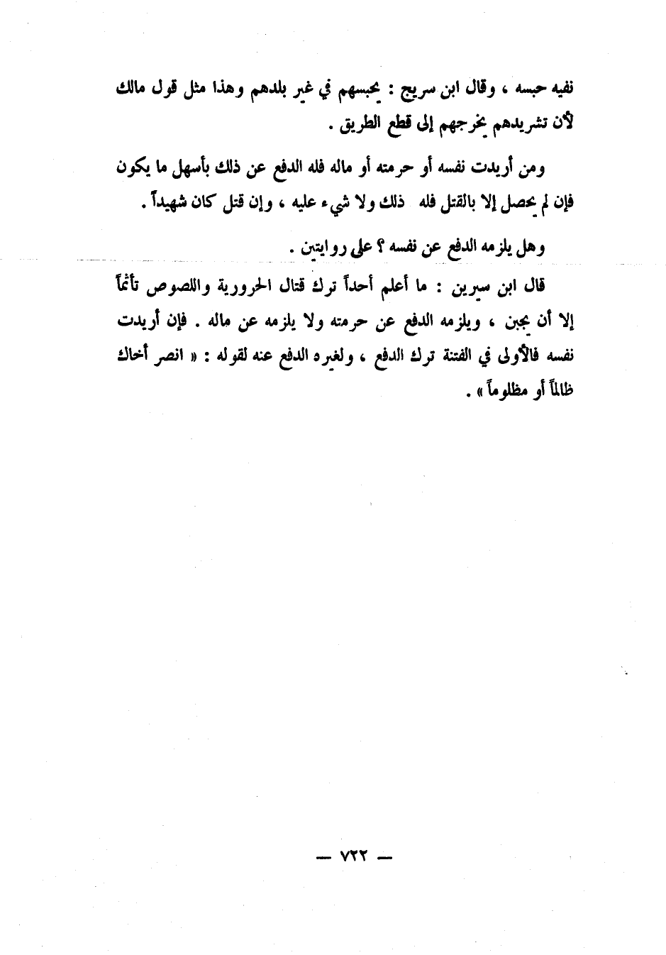 قال ابن سيرين: ما أعلم أحداً ترك قتال الحرورية واللصوص تأثماً، إلا أن يجبن. ويلزمه الدفع عن حرمته ولا يلزمه عن ماله. فإن أريدت نفسه فالأولى في الفتنة ترك الدفع، ولغيره الدفع عنه، لقوله: "انصر أخاك ظالماً أو مظلوماً" 1.