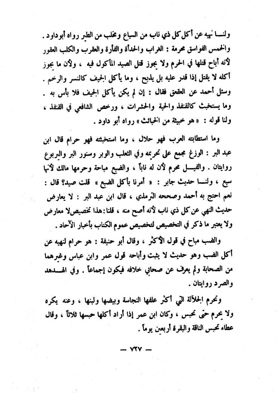 ولنا: "نهيه عن أكل كل ذي ناب من السباع ومخلب من الطير"، رواه أبو داود. والخمس الفواسق محرمة: الغراب والحدأة والفأرة والعقرب والكلب العقور، "لأنه أباح قتلها في الحرم". ولا يجوز قتل الصيد المأكول فيه، ولأن ما يجوز أكله لا يقتل إذا قدر عليه بل يذبح، وما يأكل الجيف كالنسر والرخم. وسئل أحمد عن: العقعق؟ فقال: إن لم يكن يأكل الجيف فلا بأس به، وما يستخبث كالقنفذ والحية والحشرات، ورخص الشافعي في القنفذ. ولنا: قوله: "هو خبيثة من الخبائث". 1 رواه أبو داود.