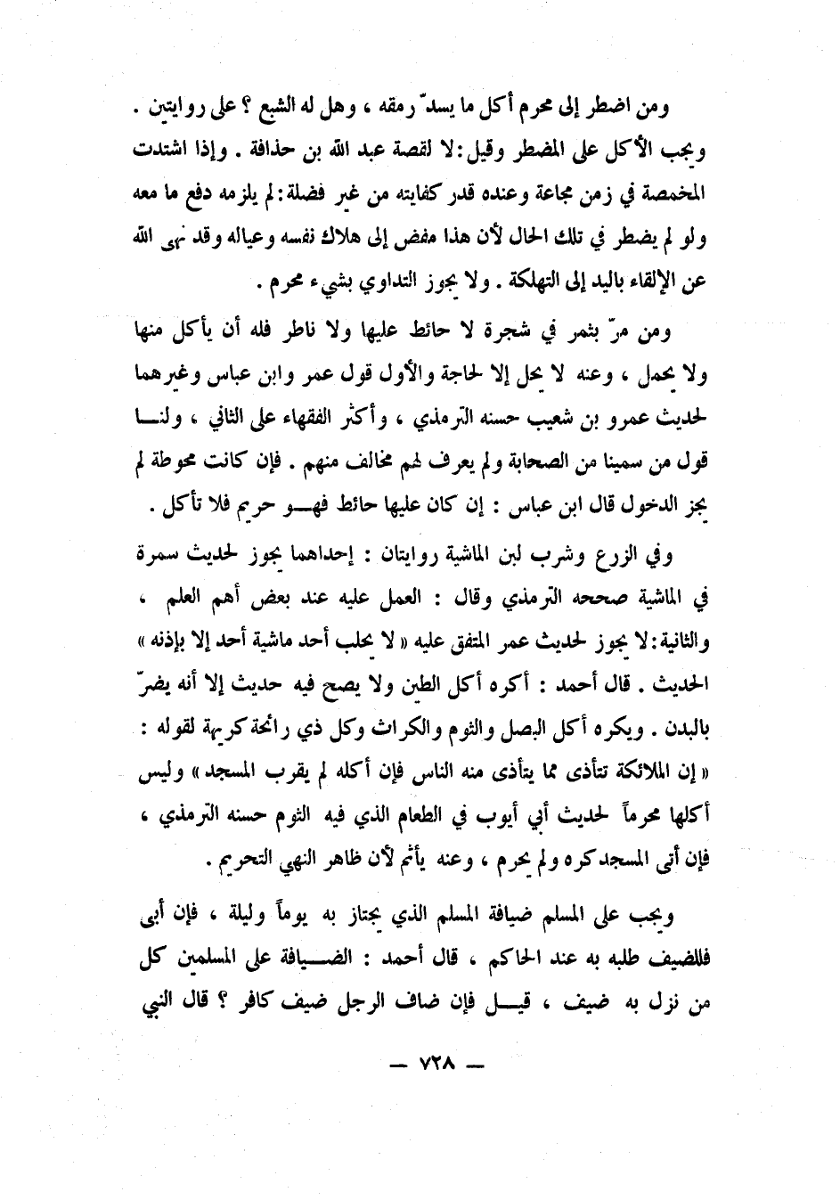 وفي الزرع وشرب لبن الماشية روايتان: إحداهما: يجوز، لحديث سمرة في الماشية، صححه الترمذي، وقال: العمل عليه عند بعض أهل العلم. والثانية: لا يجوز، لحديث عمر المتفق عليه: "لا يحلب أحد ماشية أحد إلا بإذنه" 1 الحديث. قال أحمد: أكره أكل الطين، ولا يصح فيه حديث، إلا أنه يضرّ بالبدن.