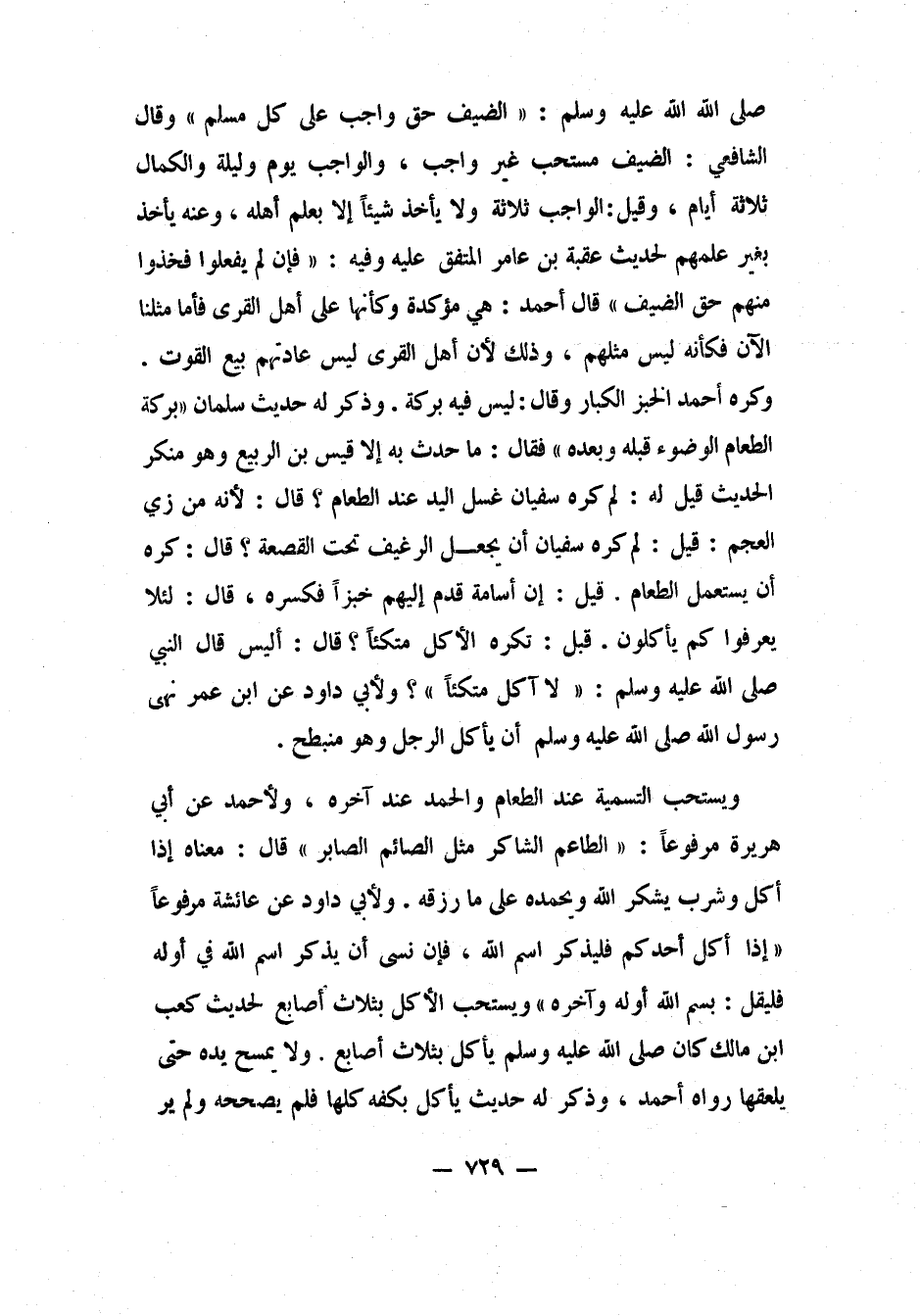 صلى الله عليه وسلم: " الضيف حق واجب على كل مسلم". 1 وقال الشافعي: الضيف مستحب غير واجب، والواجب يوم وليلة، والكمال ثلاثة أيام. وقيل: الواجب: ثلاثة، ولا يأخذ شيئاً إلا بعلم أهله. وعنه: يأخذ بغير علمهم، لحديث عقبة بن عامر المتفق عليه، وفيه: "فإن لم يفعلوا، فخذوا منهم حق الضيف". 2 قال أحمد: هي مؤكدة، وكأنها على أهل القرى، فأما مثلنا الآن فكأنه ليس مثلهم، وذلك لأن أهل القرى ليس عادتهم بيع القوت. وكره أحمد الخبز الكبار، وقال: ليس فيه بركة. وذكر له حديث سلمان: "بركة الطعام الوضوء قبله وبعده"، فقال: ما حدث به إلا قيس بن الربيع، وهو منكر الحديث. قيل له: لِم كره سفيان غسل اليد عند الطعام؟ قال: لأنه من زي العجم، قيل: لِم كره سفيان أن يجعل الرغيف تحت القصعة؟ قال: كره أن يستعمل الطعام. قيل: "إن أسامة قدم إليهم خبزاً فكسره، قال: لئلا يعرفوا كم يأكلون. قيل: تكره الأكل متكئاً؟ قال: أليس قال النبي صلى الله عليه وسلم: لا آكل متكئاً"؟ ولأبي داود عن ابن عمر: "نهى رسول الله صلى الله عليه وسلم أن يأكل الرجل وهو منبطح" 3.