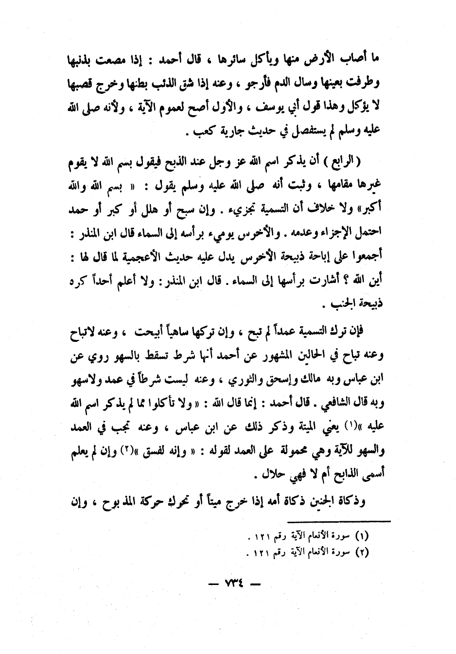 فإن ترك التسمية عمدًا لم تبَح، وإن تركها ساهياً أبيحت، وعنه: لا تباح، وعنه: تباح في الحالين. المشهور عن أحمد: "أنها شرط، تسقط بالسهو". روي عن ابن عباس؛ وبه قال مالك وإسحاق والثوري، وعنه: ليست شرطاً في عمد ولا سهو، وبه قال الشافعي. قال أحمد: "إنما قال الله: {وَلا تَأْكُلُوا مِمَّا لَمْ يُذْكَرِ اسْمُ اللَّهِ} ، 1 يعني: الميتة"، وذكر ذلك عن ابن عباس. وعنه: تجب في العمد والسهو، للآية، وهي محمولة على العمد، لقوله: {وَإِنَّهُ لَفِسْقٌ} . 2وإن لم يعلم أسمّى الذابح أم لا، فهي حلال.
