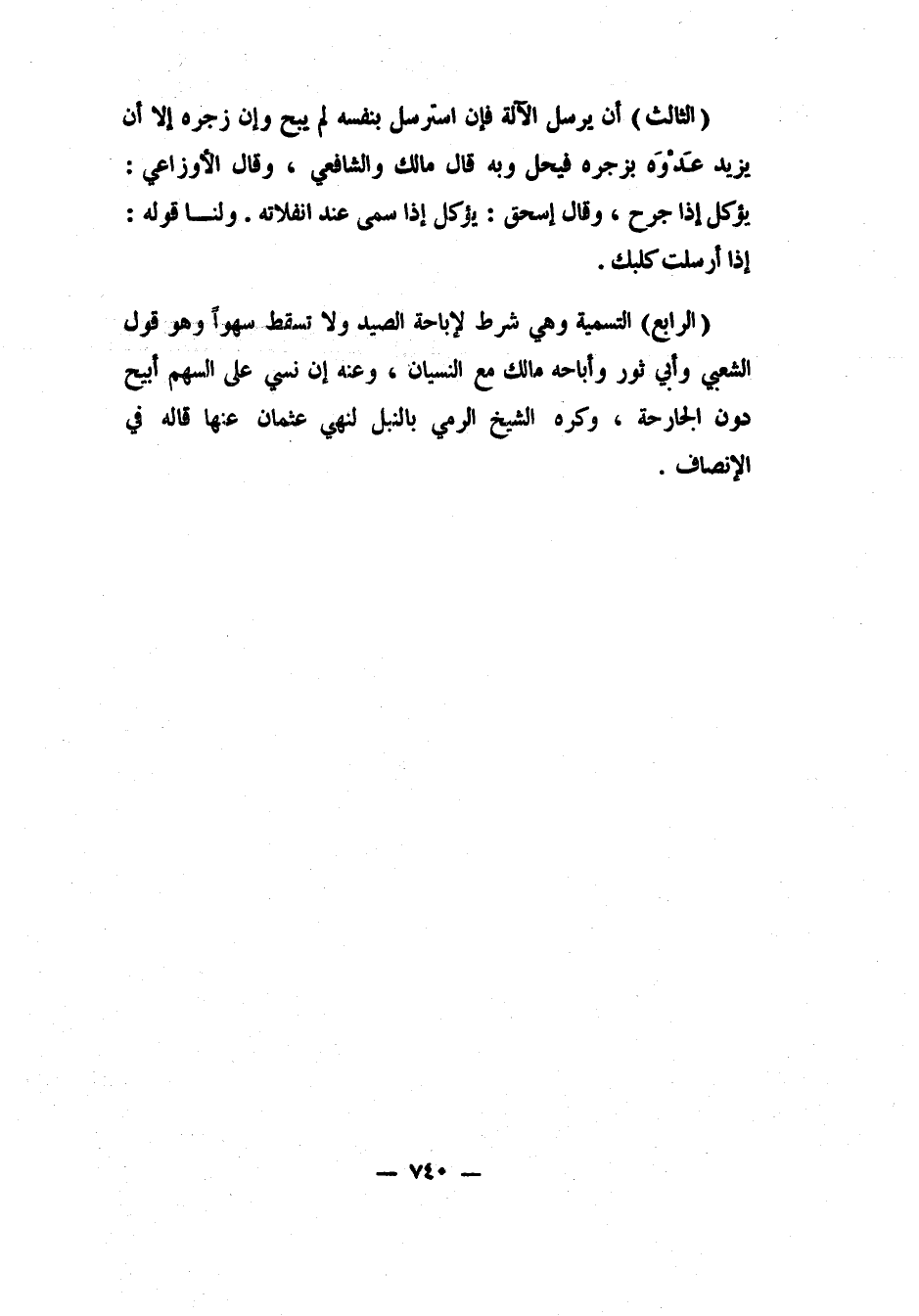 (الرابع) : التسمية، وهي شرط لإباحة الصيد، ولا تسقط سهواً؛ وهو قول الشعبي وأبي ثور. وأباحه مالك مع النسيان، وعنه: إن نسي على السهم أبيح دون الجارحة. وكره الشيخ الرمي بالنبل، لـ"نهي عثمان عنها"، قاله في الإنصاف.