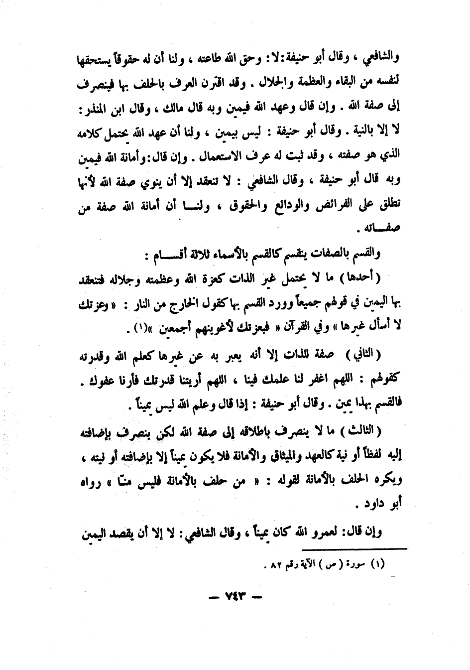 (الثالث) : ما لا ينصرف بإطلاقه إلى صفة الله، لكن ينصرف بإضافته إليه لفظاً أو نية، كالعهد والميثاق والأمانة، فلا يكون يميناً إلا بإضافته أو نيته. ويكره الحلف بالأمانة، لقوله: "من حلف بالأمانة فليس منّا". 3 رواه أبو داود.