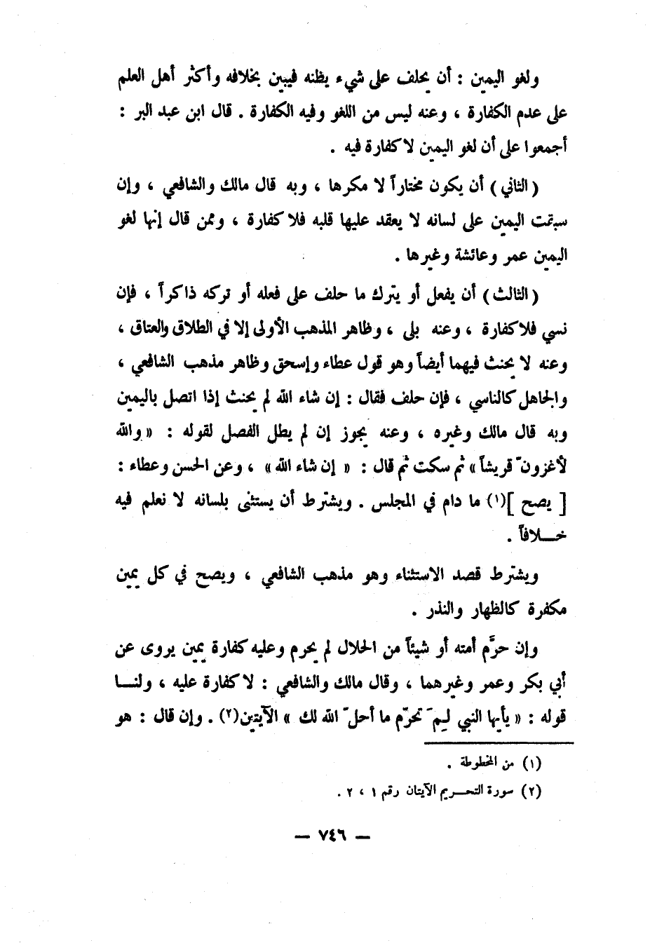 (الثاني) : أن يكون مختاراً لا مكرهاً، وبه قال مالك والشافعي. وإن سبقت اليمين على لسانه لا يعقد عليها قلبه، فلا كفارة، وممن قال: "إنها لغو اليمين": عمر وعائشة وغيرها.