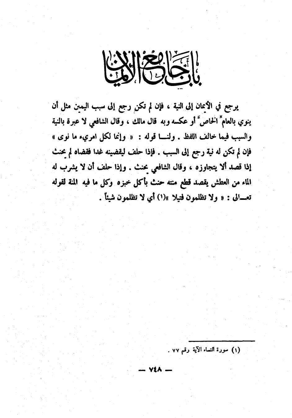 يرجع في الأيمان إلى النية، فإن لم تكن، رجع إلى سبب اليمين، مثل أن ينوي بالعامِّ الخاصَّ أو عكسه، وبه قال مالك. وقال الشافعي: لا عبرة بالنية والسبب فيما خالف اللفظ. ولنا: قوله: " وإنما لكل امرئ ما نوى". 1 فإن لم تكن له نية، رجع إلى السبب. فإذا حلف ليقضينه غداً فقضاه، لم يحنث إذا قصد ألا يتجاوزه، وقال الشافعي: يحنث. وإذا حلف أن لا يشرب له الماء من العطش، يقصد قطع منته، حنث بأكل خبزه وكل ما فيه المنة، لقوله تعالى: {وَلا تُظْلَمُونَ فَتِيلاً} 2 أي: لا تظلمون شيئاً.