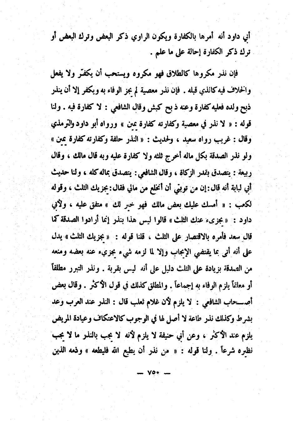 فإن نذر معصية لم يجز الوفاء به ويكفّر، إلا أن ينذر ذبح ولده، فعليه كفارة، وعنه: ذبح كبش. وقال الشافعي: لا كفارة فيه. ولنا: قوله: "لا نذر في معصية، وكفارته كفارة يمين". ورواه أبو داود والترمذي وقال: غريب رواه سعيد، ولحديث: "النذر حلفة، وكفارته كفارة يمين". ولو نذر الصدقة بكل مالِه أخرج ثلثه، ولا كفارة عليه. وبه قال مالك. وقال ربيعة: يتصدق بقدر الزكاة. وقال الشافعي: يتصدق بماله كله. ولنا: حديث أبي لبابة أنه قال: "إن من توبتي أن أنخلع من مالي، فقال: يجزيك الثلث"، وقوله لكعب: "أمسك عليك بعض مالك، فهو خير لك". 1 متفق عليه، ولأبي داود: "يجزئ عنك الثلث"، قالوا: ليس هذا بنذر، إنما أرادوا الصدقة كما قال سعد، فأمره بالاقتصار على الثلث، قلنا قوله: "يجزيك الثلث" يدل على أنه أتى بما يقتضي الإيجاب، وإلا لما لزمه شيء يجزئ عنه بعضه، ومنعه من الصدقة بزيادة على الثلث دليل على أنه ليس بقربة. ونذر التبرر مطلقاً أو معلقاً يلزم الوفاء به، إجماعاً. والمطلق كذلك، في قول الأكثر.