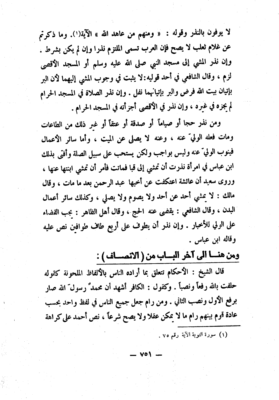 لا يوفون بالنذر. وقوله: {وَمِنْهُمْ مَنْ عَاهَدَ اللَّهَ} الآية. 1 وما ذكرتم عن غلام ثعلب لا يصح، فإن العرب تسمى الملتزم نذراً وإن لم يكن بشرط. وإن نذر المشي إلى مسجد النبي صلى الله عليه وسلم أو المسجد الأقصى لزم، وقال الشافعي في أحد قوليه: لا يثبت في وجوب المشي إليهما، لأن البر بإتيان بيت الله فرض، والبر بإتيانهما نفل. وإن نذر الصلاة في المسجد الحرام لم يجزه في غيره، وإن نذر في الأقصى أجزأته في المسجد الحرام.