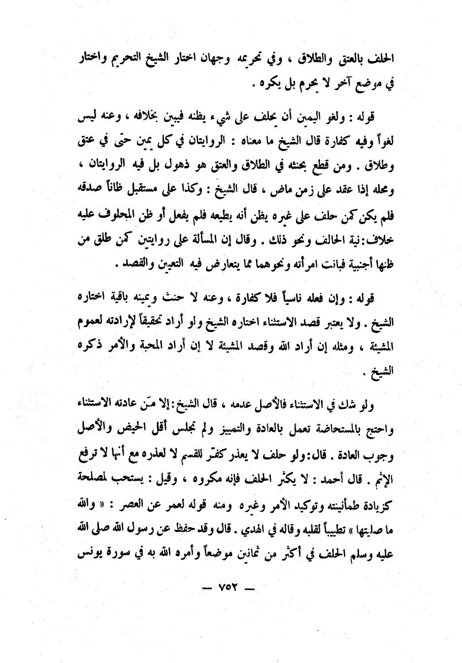 ولو شك في الاستثناء فالأصل عدمه، قال الشيخ: إلا مَن عادته الاستثناء، واحتج بالمستحاضة تعمل بالعادة والتمييز ولم تجلس أقل الحيض، والأصل: وجوب العادة. قال: ولو حلف لا يعذر كفّر، للقسم لا لعذره، مع أنها لا ترفع الإثم. قال أحمد: لا يكثر الحلف فإنه مكروه، وقيل: يستحب لمصلحة كزيادة طمأنينته وتوكيد الأمر وغيره، ومنه قوله لعمر عن العصر: "والله ما صليتها"، تطييباً لقلبه. وقاله في الهدي قال: و"قد حفظ عن رسول الله صلى الله عليه وسلم الحلف في أكثر من ثمانين موضعاً وأمره الله به في سورة "يونس"