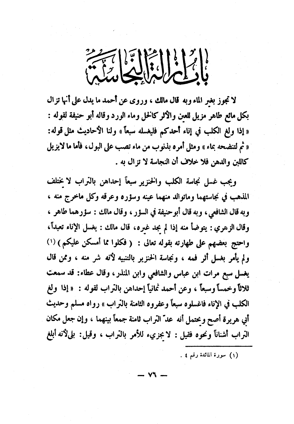 ويجب غسل نجاسة الكلب والخنزير سبعاً، إحداهن بالتراب، لا يختلف المذهب في نجاستهما وما توالد منهما، عينه وسؤره وعرقه وكل ما خرج منه؛ وبه قال الشافعي، وبه قال أبو حنيفة في السؤر. وقال مالك: سؤرهما طاهر. وقال الزهري: يتوضأ منه إذا لم يجد غيره. قال مالك: يغسل الإناء تعبداً. واحتج بعضهم على طهارته بقوله تعالى: {فكلوا مما أمسكن عليكم} ، 2 ولم يأمر بغسل أثر فمه. ونجاسة الخنزير بالتنبيه لأنه شر منه. وممن قال: "يغسل سبع مرات": ابن عباس والشافعي وابن المنذر. وقال عطاء: قد سمعت ثلاثاً وخمساً وسبعاً، وعن أحمد ثمانياً، إحداهن بالتراب، لقوله: "إذا ولغ الكلب في الإناء، فاغسلوه سبعاً، وعفروه الثامنة بالتراب". 3 رواه مسلم. وحديث أبي هريرة أصح، ويحتمل أنه عدّ التراب ثامنة، جمعاً بينهما. وإن جعل مكان التراب أشناناً ونحوه، فقيل: لا يجزئ، للأمر بالتراب. وقيل: بلى، لأنه أبلغ