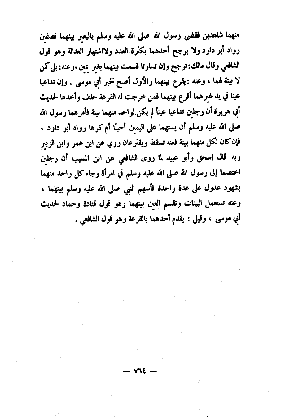 منهما شاهدين؛ فقضى رسول الله صلى الله عليه وسلم بالبعير بينهما نصفين". 1 رواه أبو داود. ولا يرجح أحدهما بكثرة العدد، ولا اشتهار العدالة؛ وهو قول الشافعي. وقال مالك: ترجح، وإن تساوتا قسمت بينهما بغير يمين، وعنه: بلى، كمن لا بيّنة لهما. وعنه: يقرع بينهما. والأول أصح، لخبر أبي موسى.