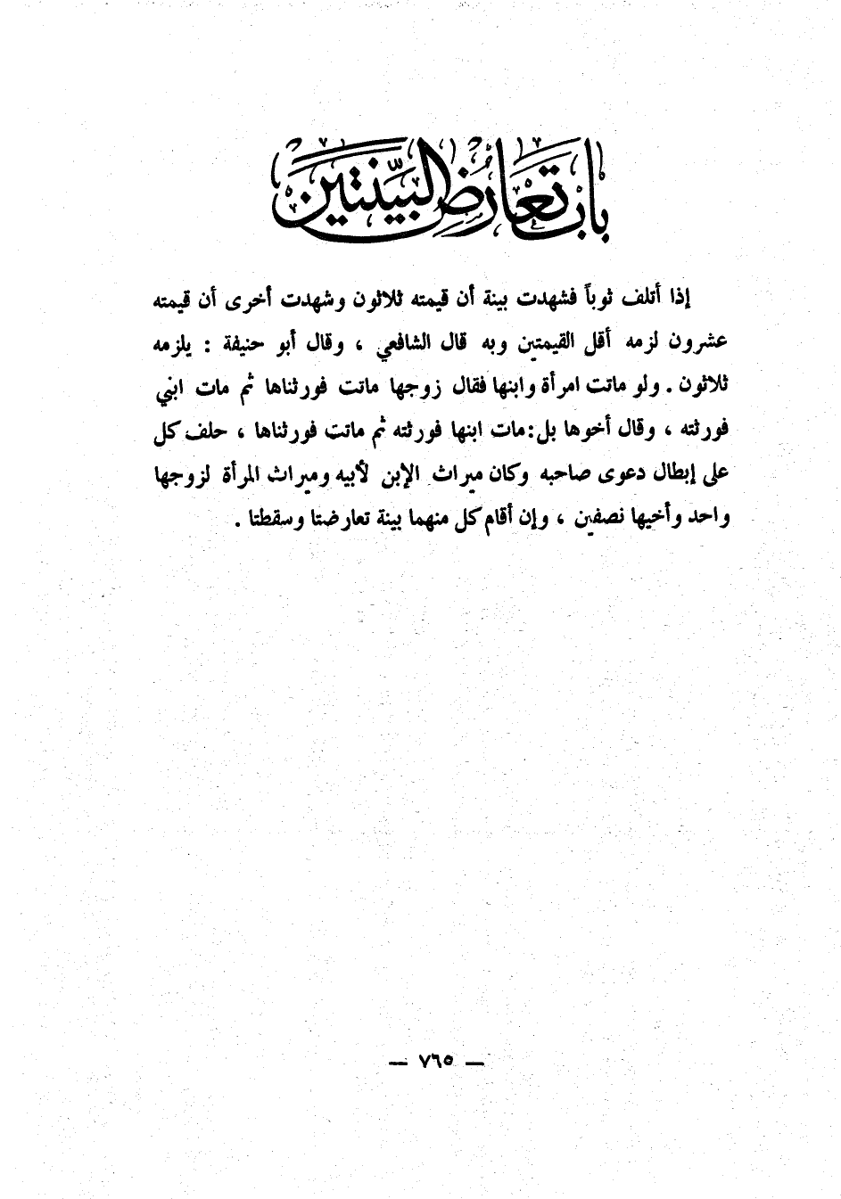 ولو ماتت امرأة وابنها، فقال زوجها: ماتت فورثناها، ثم مات ابني فورثته. وقال أخوها: بل مات ابنها فورثتْه، ثم ماتت فورثناها. حلف كل على إبطال دعوى صاحبه، وكان ميراث الابن لأبيه، وميراث المرأة: لزوجها واحد وأخيها نصفين. وإن أقام كل منهما بيّنة، تعارضتا وسقطتا.