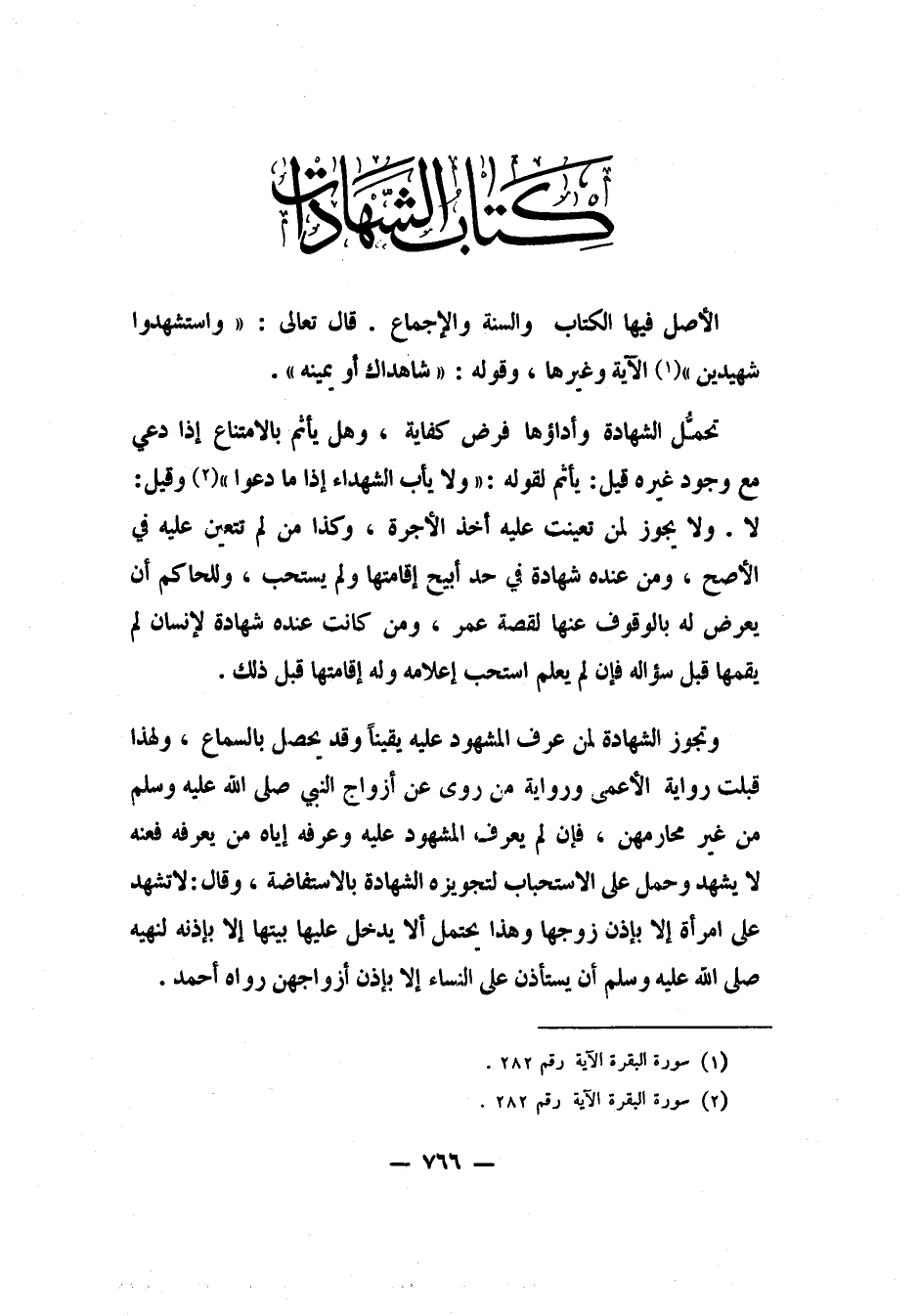 وتجوز الشهادة لمن عرف المشهود عليه يقيناً، وقد يحصل بالسماع؛ ولهذا قبلت رواية الأعمى، ورواية من روى عن أزواج النبي صلى الله عليه وسلم من غير محارمهن. فإن لم يعرف المشهود عليه وعرفه إياه من يعرفه، فعنه: لا يشهد، وحمل على الاستحباب، لتجويزه الشهادة بالاستفاضة. وقال: لا تشهد على امرأة إلا بإذن زوجها، وهذا يحتمل ألا يدخل عليها بيتها إلا بإذنه لِـ"نهيه صلى الله عليه وسلم أن يستأذن على النساء إلا بإذن أزواجهن". رواه أحمد.
