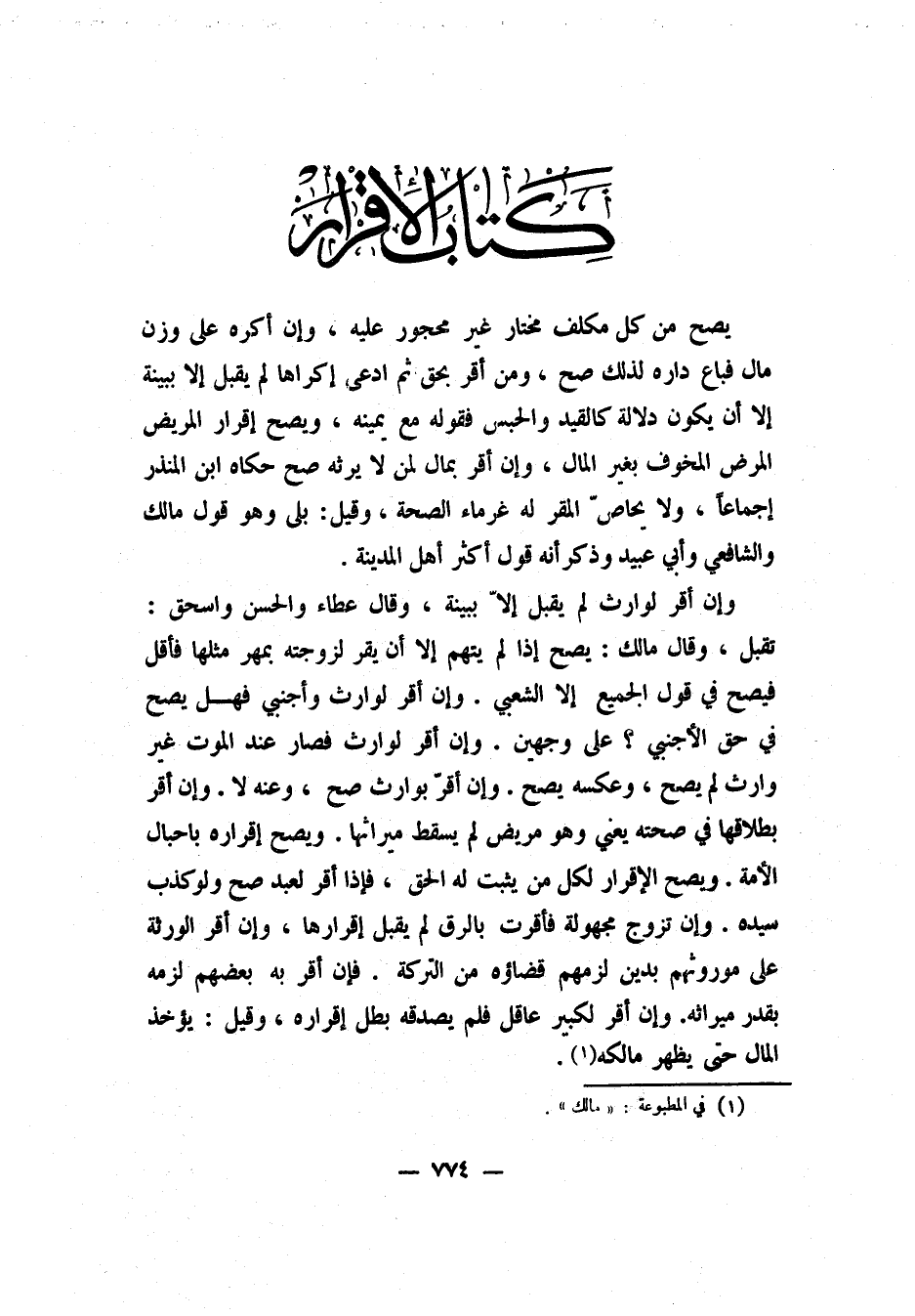 ويصح الإقرار لكل من يثبت له الحق، فإذا أقر لعبد صح، ولو كذب سيده. وإن تزوج مجهولة فأقرت بالرق، لم يقبل إقرارها. وإن أقر الورثة على موروثهم بديْن، لزمهم قضاؤه من التركة. فإن أقر به بعضهم، لزمه بقدر ميراثه. وإن أقر لكبير عاقل فلم يصدّقه، بطل إقراره، وقيل: يؤخذ المال حتى يظهر مالكه 1.