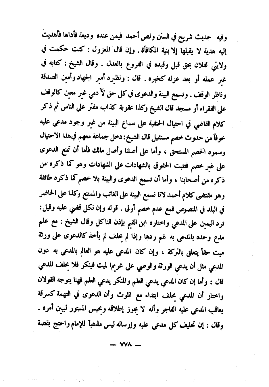 وقال الشيخ: كتابه في غير عمله أو بعد عزله كخبره. قال: ونظيره أمير الجهاد، وأمين الصدقة، وناظر الوقف. وتسمع البيّنة والدعوى في كل حق لآدمي غير معيّن، كالوقف على الفقراء أو مسجد، قال الشيخ: وكذا عقوبة كذاب مفتر على الناس. ثم ذكر كلام القاضي في احتيال الحنفية على سماع البيّنة من غير وجود مدعى عليه، خوفاً من حدوث خصم مستقبل، قال الشيخ: دخل جماعة معهم في هذا الاحتيال، وسموه الخصم المستحق، وأما على أصلنا وأصل مالك: فإما أن تمنع الدعوى على غير خصم فتثبت الحقوق بالشهادات على الشهادات، وهو كما ذكره من ذكره من أصحابنا، وإما أن تسمع الدعوى والبيّنة بلا خصم، كما ذكره طائفة؛ وهو مقتضى كلام أحمد، لأنا نسمع البيّنة على الغائب والممتنع وكذا على الحاضر في البلد في المنصوص فمع عدم خصم أولى.