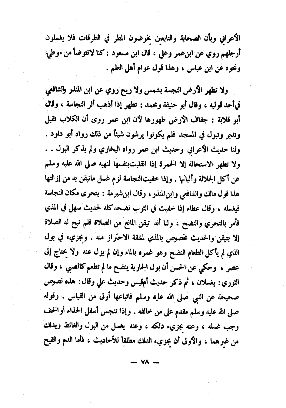 الأعرابي، وبـ"أن الصحابة والتابعين يخوضون المطر في الطرقات، فلا يغسلون أرجلهم"، روي عن ابن عمر وعلي. قال ابن مسعود: "كنا لا نتوضأ من موطئ"، ونحوه عن ابن عباس؛ وهذا قول عوام أهل العلم.