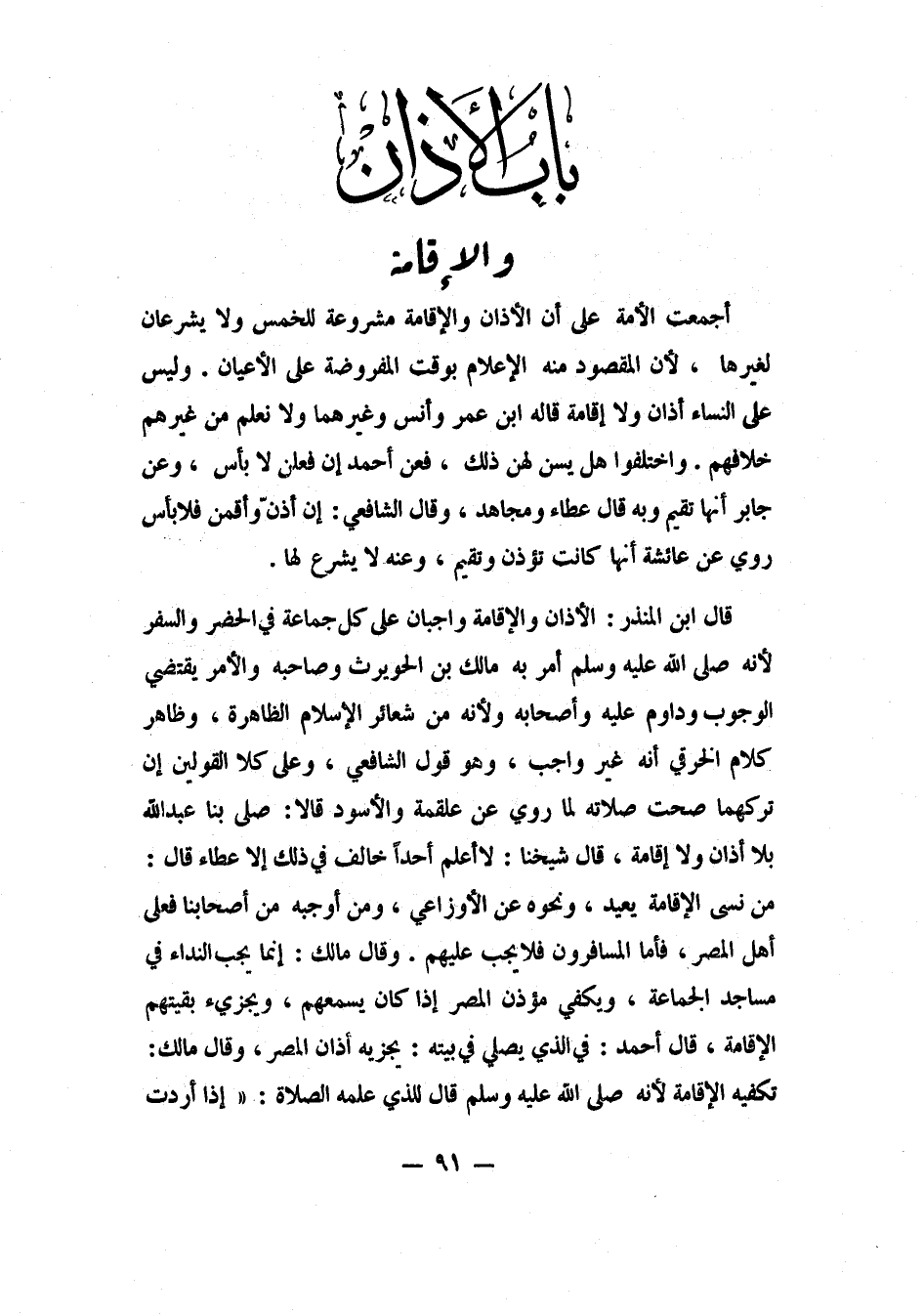قال ابن المنذر: الأذان والإقامة واجبان على كل جماعة في الحضر والسفر، لأنه صلى الله عليه وسلم أمر به مالك بن الحويرث وصاحبه؛ والأمر يقتضي الوجوب، وداوم عليه وأصحابه، ولأنه من شعائر الإسلام الظاهرة. وظاهر كلام الخرقي أنه غير واجب، وهو قول الشافعي. وعلى كلا القولين، إن تركهما صحت صلاته، لما روي عن علقمة والأسود قالا: "صلى بنا عبد الله بلا أذان ولا إقامة". قال شيخنا: لا أعلم أحداً خالف في ذلك، إلا عطاء قال: من نسي الإقامة يعيد، ونحوه عن الأوزاعي. ومن أوجبه من أصحابنا فعلى أهل المصر، فأما المسافرون فلا يجب عليهم.