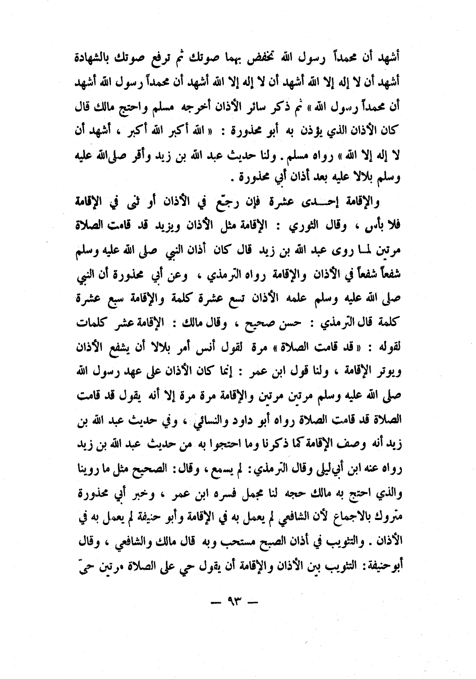 أشهد أن محمداً رسول الله. تخفض بهما صوتك. ثم ترفع صوتك بالشهادة: أشهد أن لا إله إلا الله، أشهد أن لا إله إلا الله. أشهد أن محمداً رسول الله، أشهد أن محمداً رسول الله". 1 ثم ذكر سائر الأذان. أخرجه مسلم. واحتج مالك قال: كان الأذان الذي يؤذن به أبو محذورة: "الله أكبر. الله أكبر. أشهد أن لا إله إلا الله". 2 رواه مسلم. ولنا: حديث عبد الله بن زيد، وأقر صلى الله عليه وسلم بلالاً عليه، بعد أذان أبي محذورة.