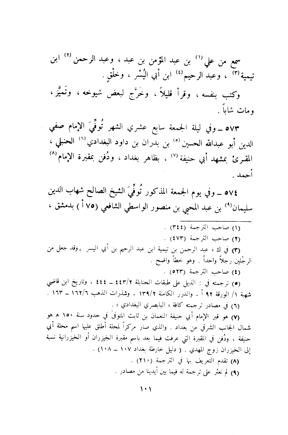 573 - وَفِي لَيْلَة الْجُمُعَة سَابِع عشري الشَّهْر توفّي الإِمَام صفي الدّين أَبُو عبد الله الْحُسَيْن بن بدران بن دَاوُد الْبَغْدَادِيّ الْحَنْبَلِيّ المقرىء بمشهد ابي حنيفَة بِظَاهِر بَغْدَاد وَدفن بمقبرة الإِمَام أَحْمد